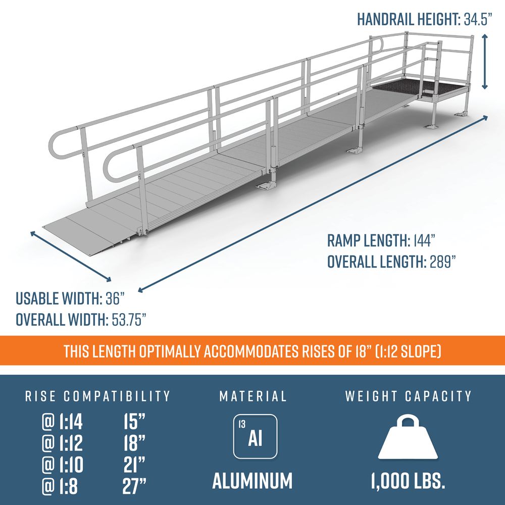 This 18' L Straight Wheelchair Ramp Kit With 4' Top Platform includes three 6' ramps, one 4' x 4' top platform, handrails, and all other necessary components.