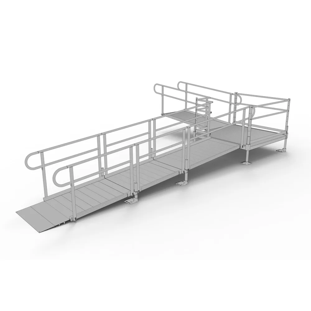This 20' L L-Shaped Wheelchair Ramp Kit With 5' Turn Platform includes two 6' ramps, two 4' ramps, one 5' x 5' turn platform, handrails, and all other necessary components.