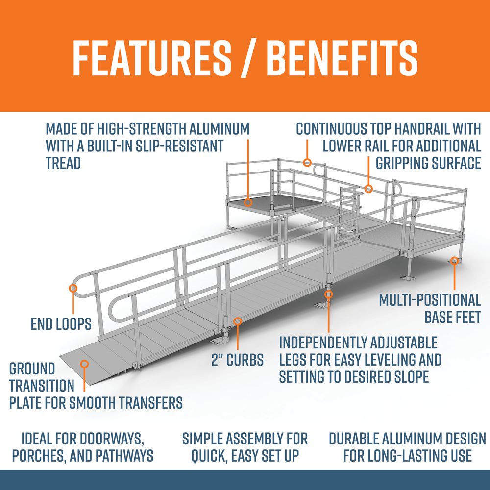 Durable, dependable, and American made, the modular design installs easily with minimal tools, meaning you can have a solution that's ready to be used the day that it arrives. Constructed from high-strength aluminum with an extruded tread for all-weather traction, the ramp kit features multi-positional base feet with independently-adjustable legs so that setting the slope and leveling the ramp is as easy as possible. A lower plate ensure smooth ramp-to-ground transitions for mobility devices, and both the 2" curbs and two-tier handrails provide additional safety and security whether wheeling or walking.