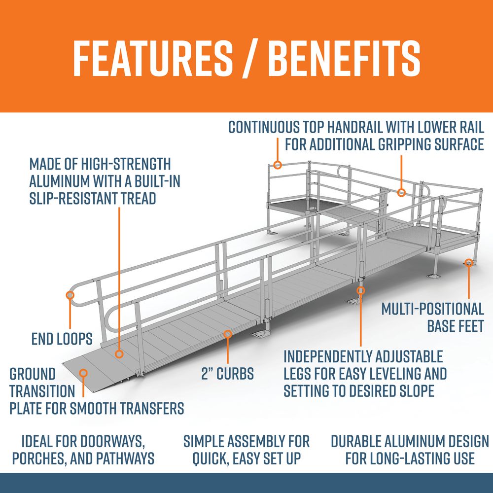 Durable, dependable, and American made, the modular design installs easily with minimal tools, meaning you can have a solution that's ready to be used the day that it arrives. Constructed from high-strength aluminum with an extruded tread for all-weather traction, the ramp kit features multi-positional base feet with independently-adjustable legs so that setting the slope and leveling the ramp is as easy as possible. A lower plate ensure smooth ramp-to-ground transitions for mobility devices, and both the 2" curbs and two-tier handrails provide additional safety and security whether wheeling or walking.