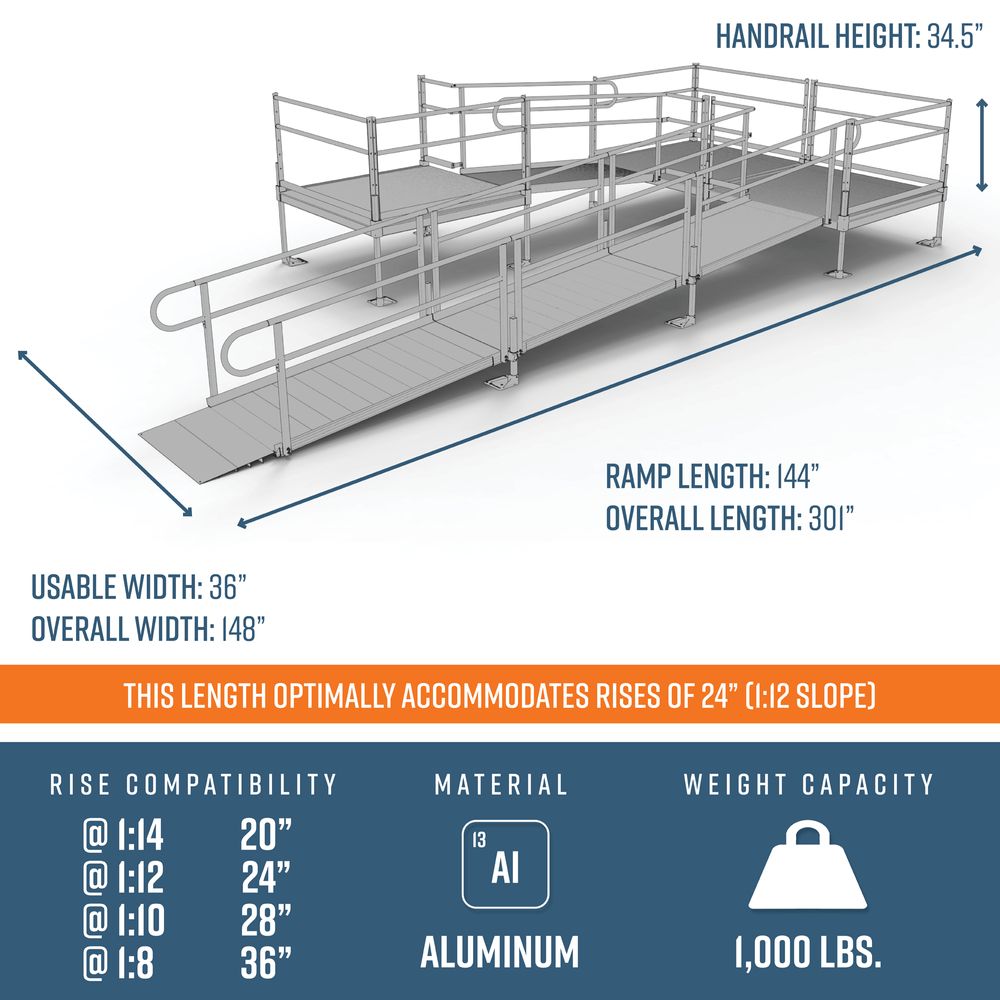 - Includes: Four 6' ramps, one 5' x 5' top platform, two 5' x 5' turn platforms, handrails, and all other necessary components