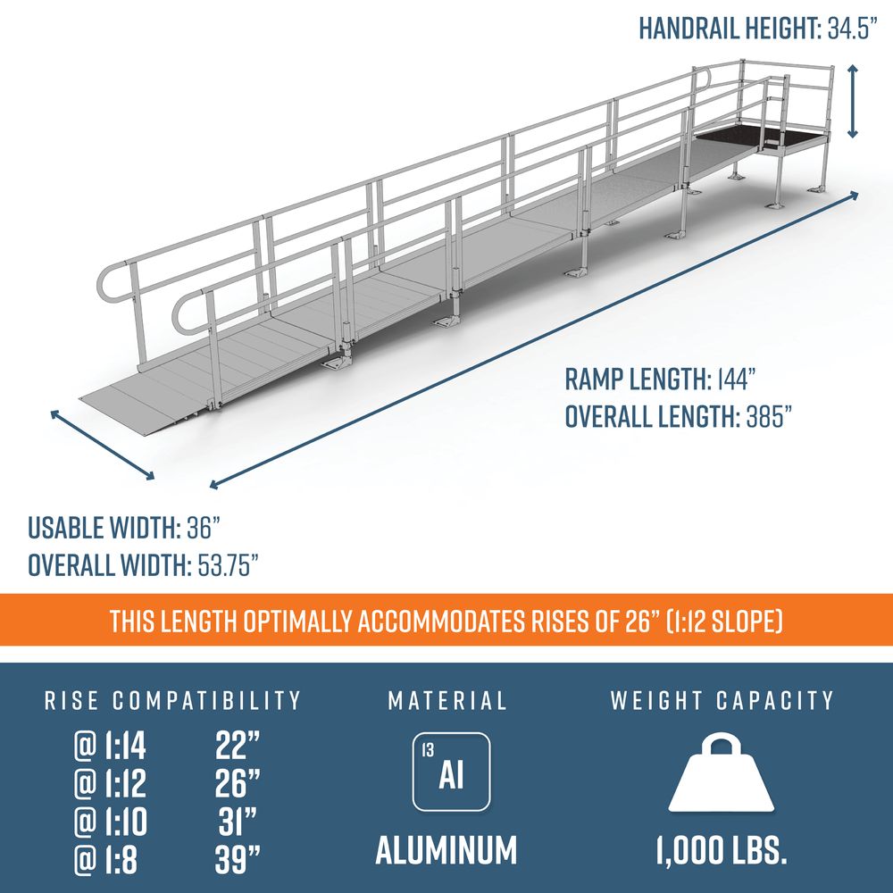 This 26' L Straight Wheelchair Ramp Kit With 4' Top Platform includes three 6' ramps, two 4' ramps, one 4' x 4' top platform, handrails, and all other necessary components.