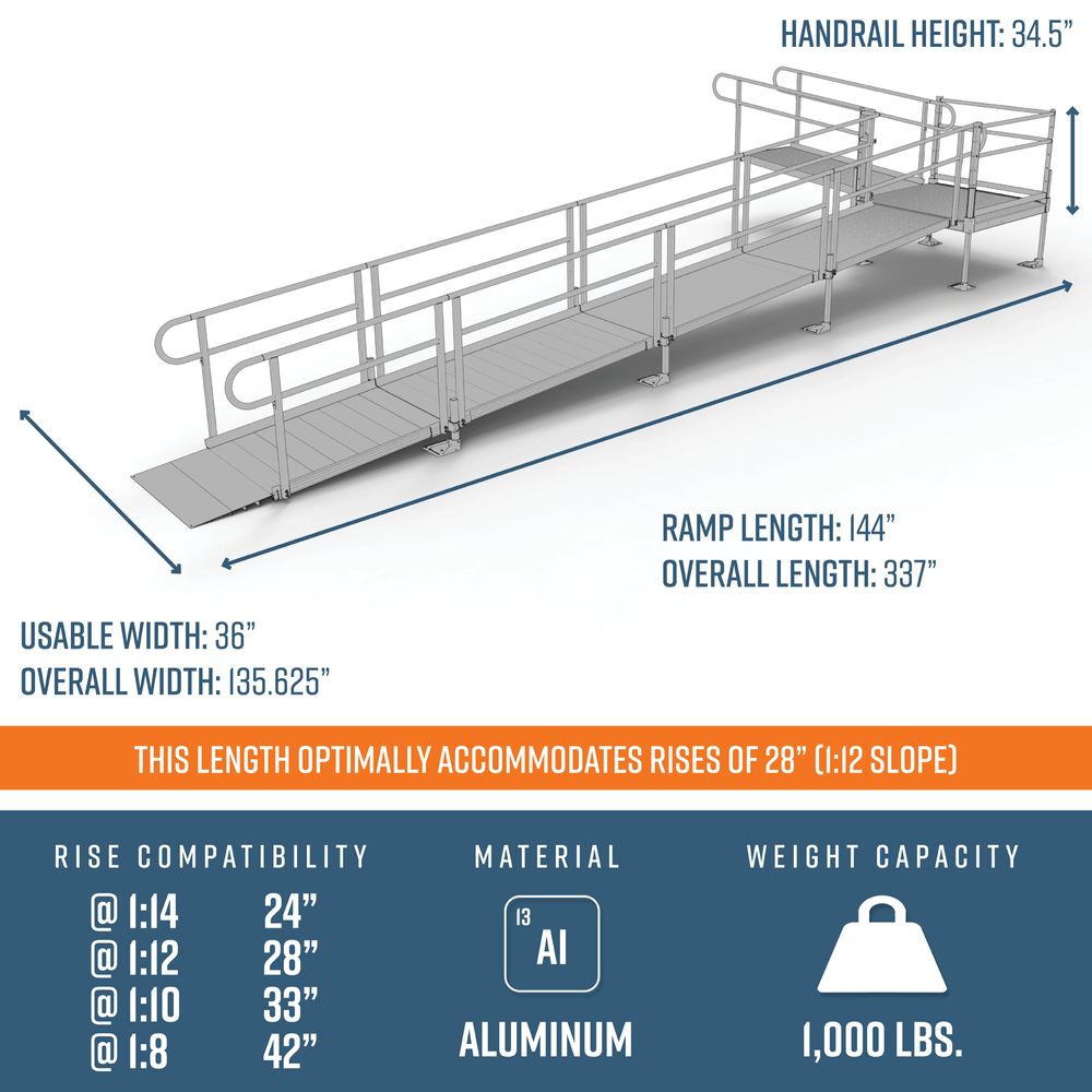 - Includes: Four 6' ramps, one 4' ramp, one 4' x 4' turn platform, handrails, and all other necessary components