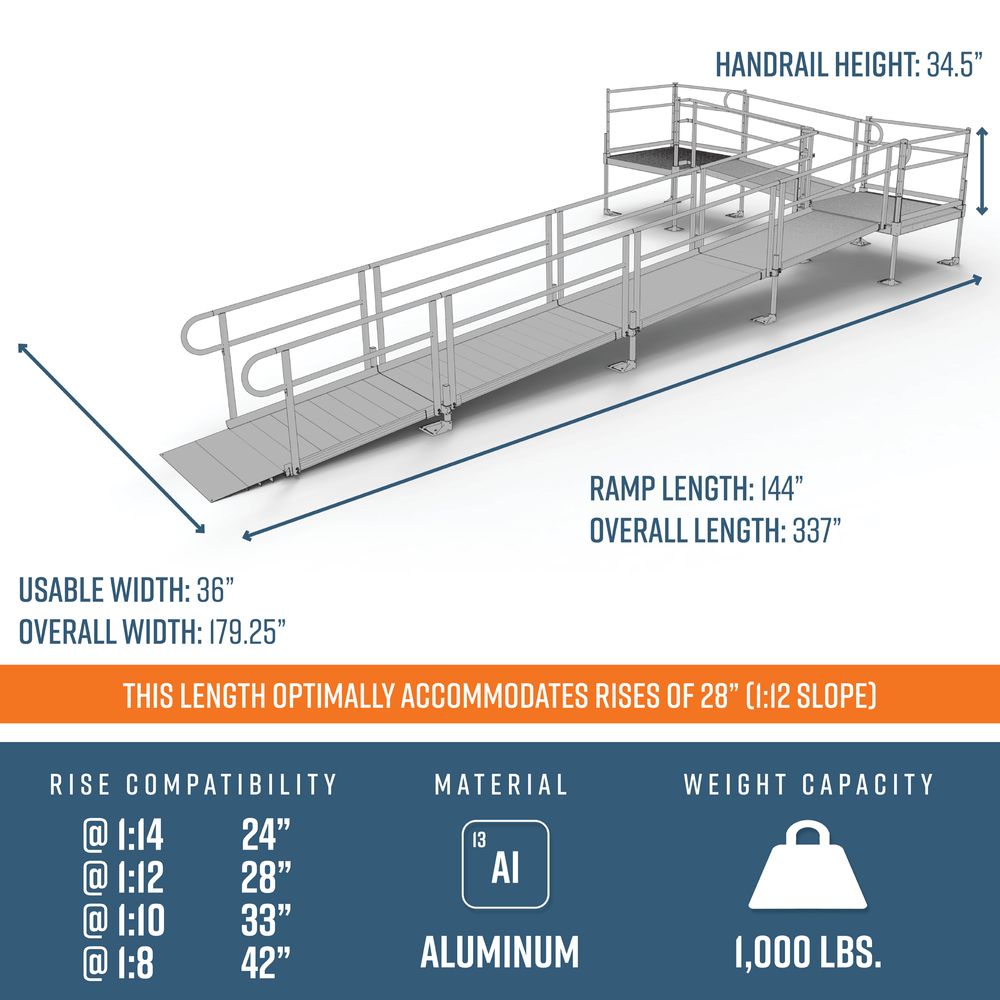 28' L x 3' W EZ-ACCESS® PATHWAY L-Shaped Aluminum Wheelchair Ramp Kit With 4' Platforms