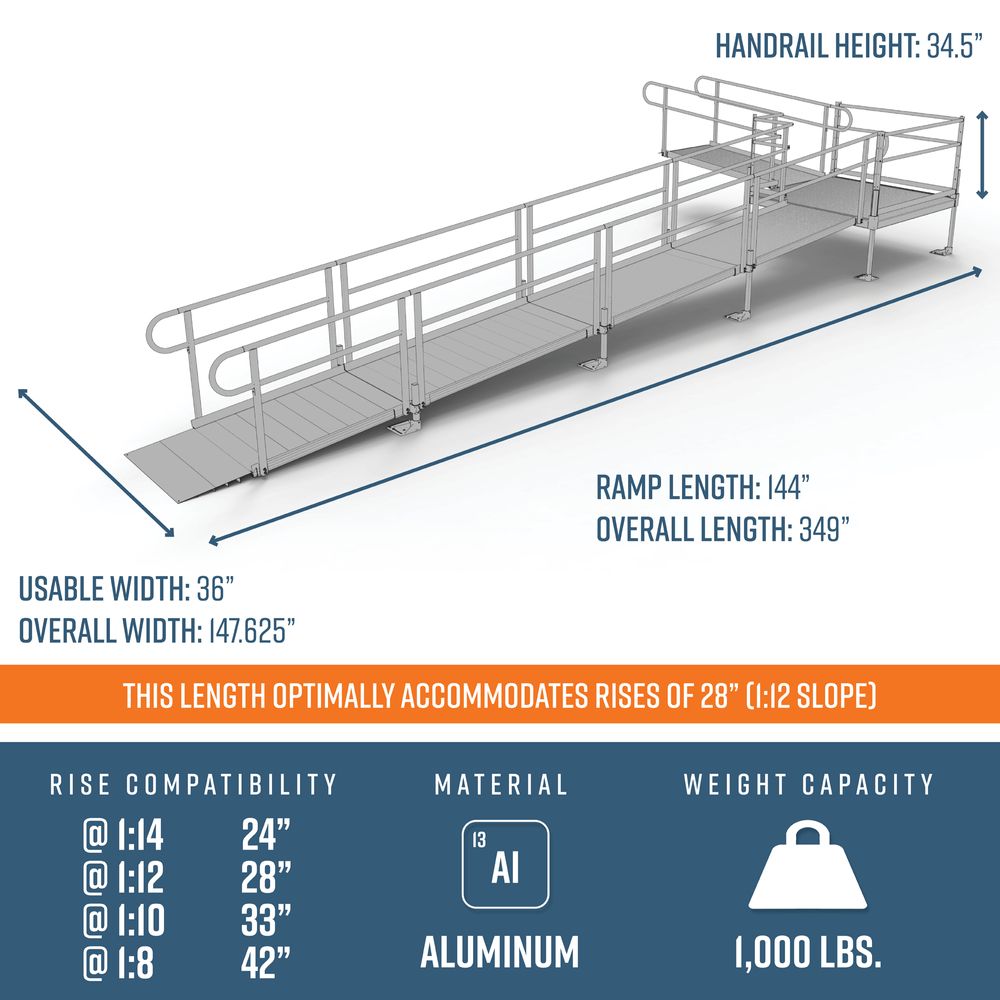 - Includes: Four 6' ramps, one 4' ramp, one 5' x 5' turn platform, handrails, and all other necessary components