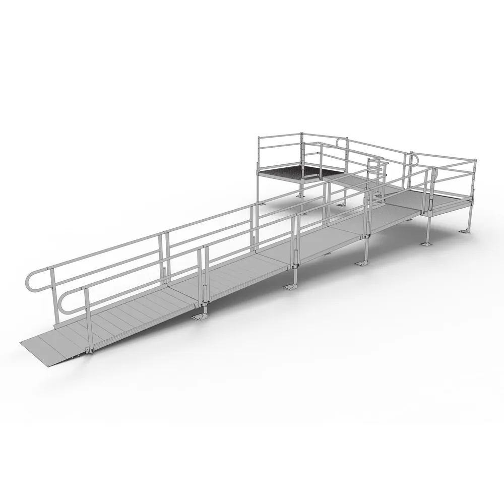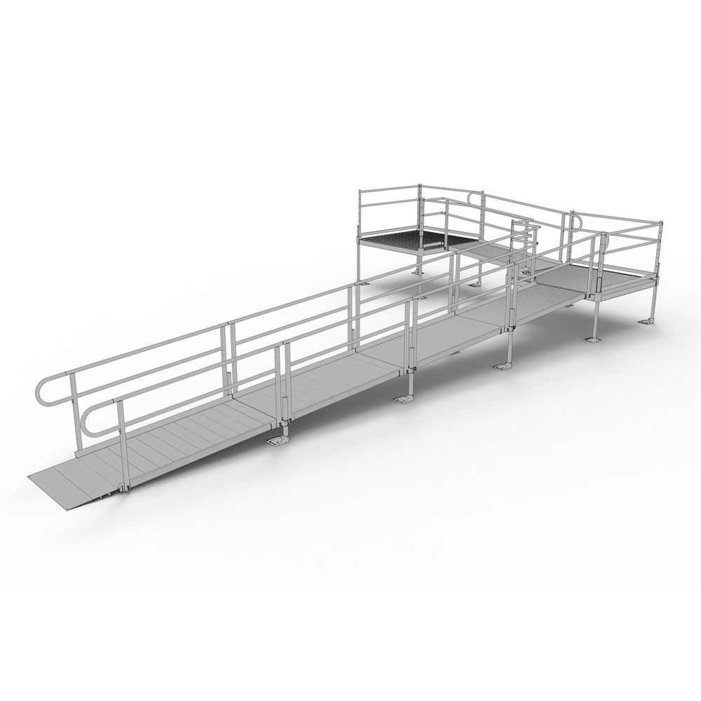 This 30' L L-Shaped Wheelchair Ramp Kit With 5' Platforms includes five 6' ramps, one 5' x 5' top platform, one 5' x 5' turn platform, handrails, and all other necessary components.