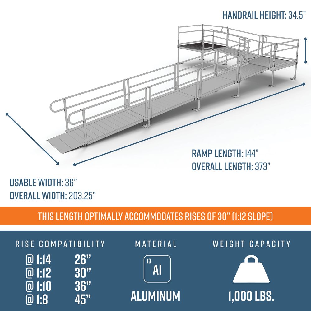 - Includes: Five 6' ramps, one 5' x 5' top platform, one 5' x 5' turn platform, handrails, and all other necessary components