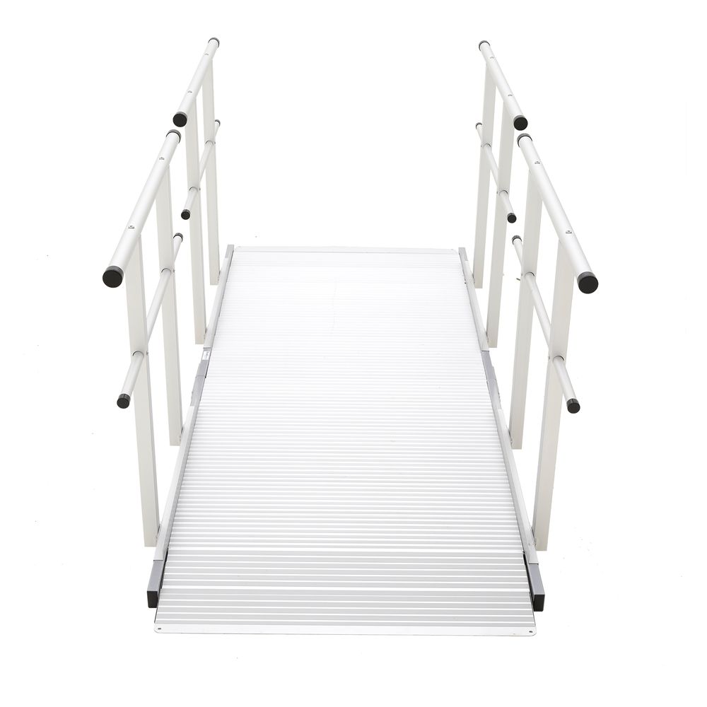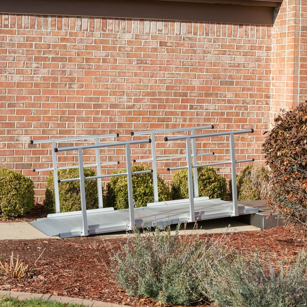 Manufactured of lightweight, high-strength aluminum with a slip-resistant surface texture, this ramp is weatherproof and durable for years of maintenance-free use. The two-level handrails accommodate adults and children who walk by themselves or assisted, in addition to individuals in manual or electric wheelchairs or scooters.