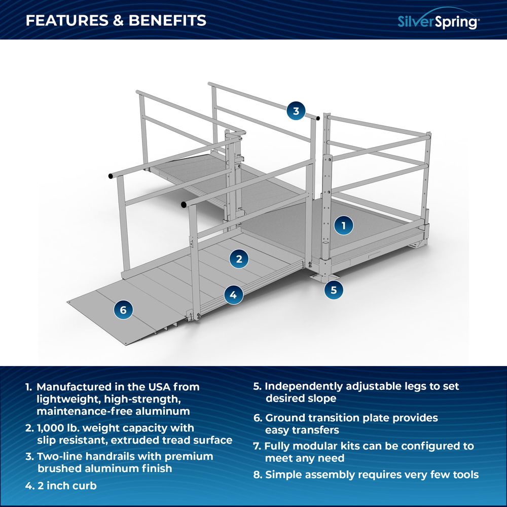 - Includes one 6' ramp, one 4'x4' turn platform, one 5' ramp, and accompanying two-line brushed aluminum handrails for added support.
