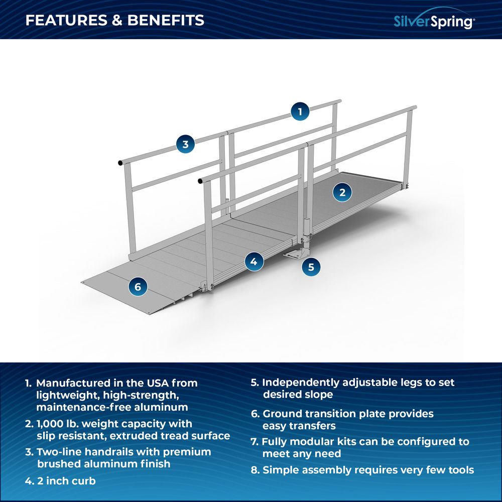 Designed with your needs in mind, the Silver Spring Clearway Modular Ramp System ships rapidly and assembles with fewer tools than other modular systems. Manufactured in the United States from high-strength, lightweight aluminum that will never rust or require painting, this system includes everything you need for installation straight out of the box. Use it to overcome rises with a slope range from 1:6 to 1:14, perfect for home entryways and similar residential applications.