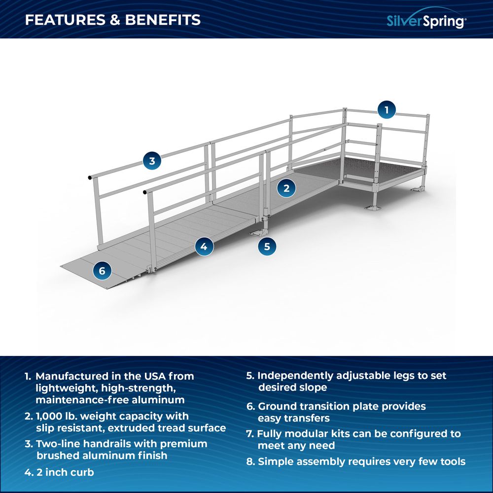 Designed with your needs in mind, the Silver Spring Clearway Modular Ramp System ships rapidly and assembles with fewer tools than other modular systems. Manufactured in the United States from high-strength, lightweight aluminum that will never rust or require painting, this system includes everything you need for installation straight out of the box. Use it to overcome rises with a slope range from 1:6 to 1:14, perfect for home entryways and similar residential applications.