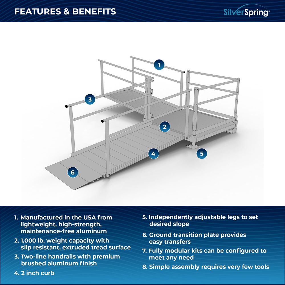 Designed with your needs in mind, the Silver Spring Clearway Modular Ramp System ships rapidly and assembles with fewer tools than other modular systems. Manufactured in the United States from high-strength, lightweight aluminum that will never rust or require painting, this system includes everything you need for installation straight out of the box. Use it to overcome rises with a slope range from 1:6 to 1:14, perfect for home entryways and similar residential applications.