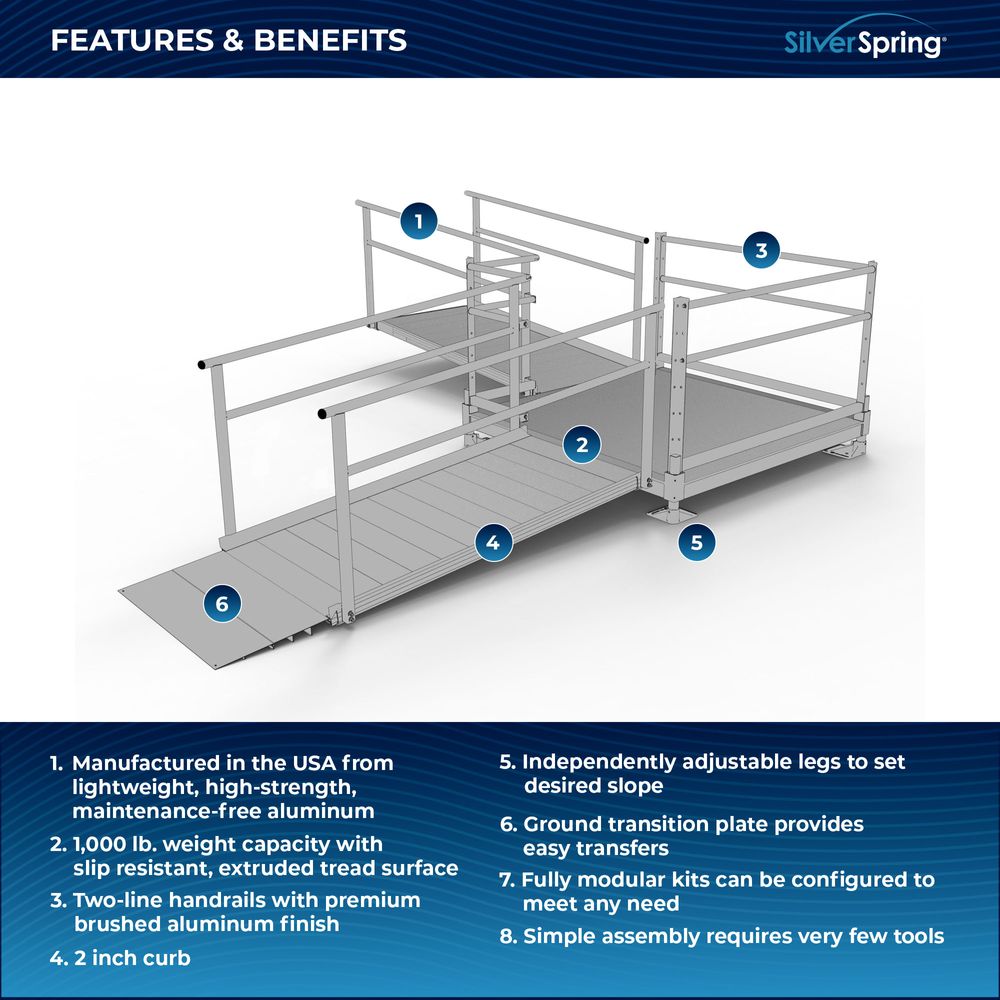 Designed with your needs in mind, the Silver Spring Clearway Modular Ramp System ships rapidly and assembles with fewer tools than other modular systems. Manufactured in the United States from high-strength, lightweight aluminum that will never rust or require painting, this system includes everything you need for installation straight out of the box. Use it to overcome rises with a slope range from 1:6 to 1:14, perfect for home entryways and similar residential applications.