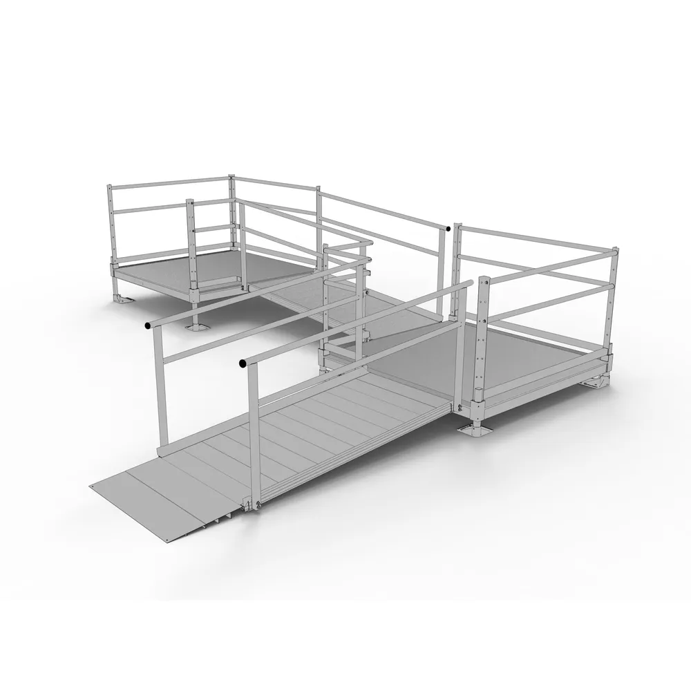 - Includes one 5'x5' top platform, one 6' ramp, one 5'x5' turn platform, one 4' ramp, one 3' ramp, and accompanying two-line brushed aluminum handrails for added support.