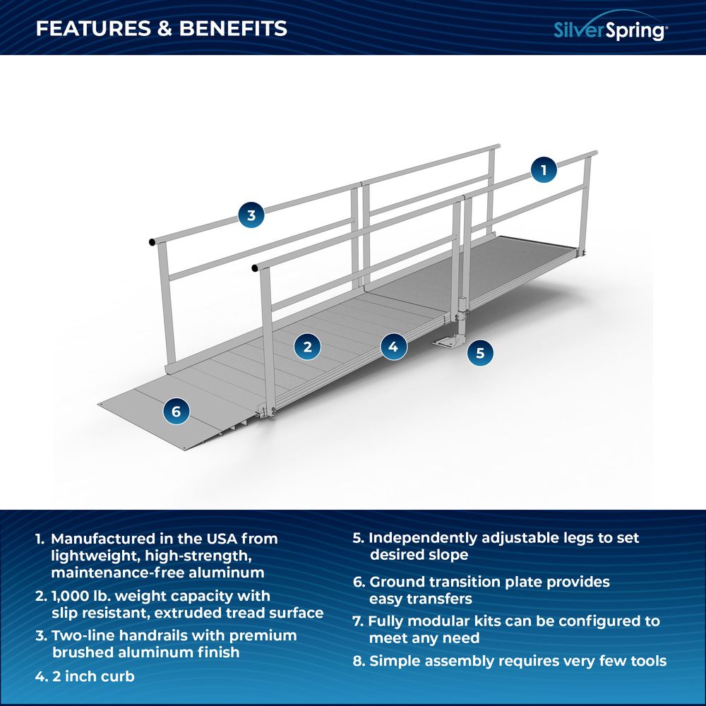 Designed with your needs in mind, the Silver Spring Clearway Modular Ramp System ships rapidly and assembles with fewer tools than other modular systems. Manufactured in the United States from high-strength, lightweight aluminum that will never rust or require painting, this system includes everything you need for installation straight out of the box. Use it to overcome rises with a slope range from 1:6 to 1:14, perfect for home entryways and similar residential applications.