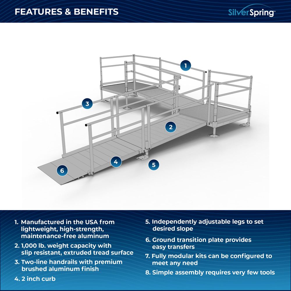 Designed with your needs in mind, the Silver Spring Clearway Modular Ramp System ships rapidly and assembles with fewer tools than other modular systems. Manufactured in the United States from high-strength, lightweight aluminum that will never rust or require painting, this system includes everything you need for installation straight out of the box. Use it to overcome rises with a slope range from 1:6 to 1:14, perfect for home entryways and similar residential applications.