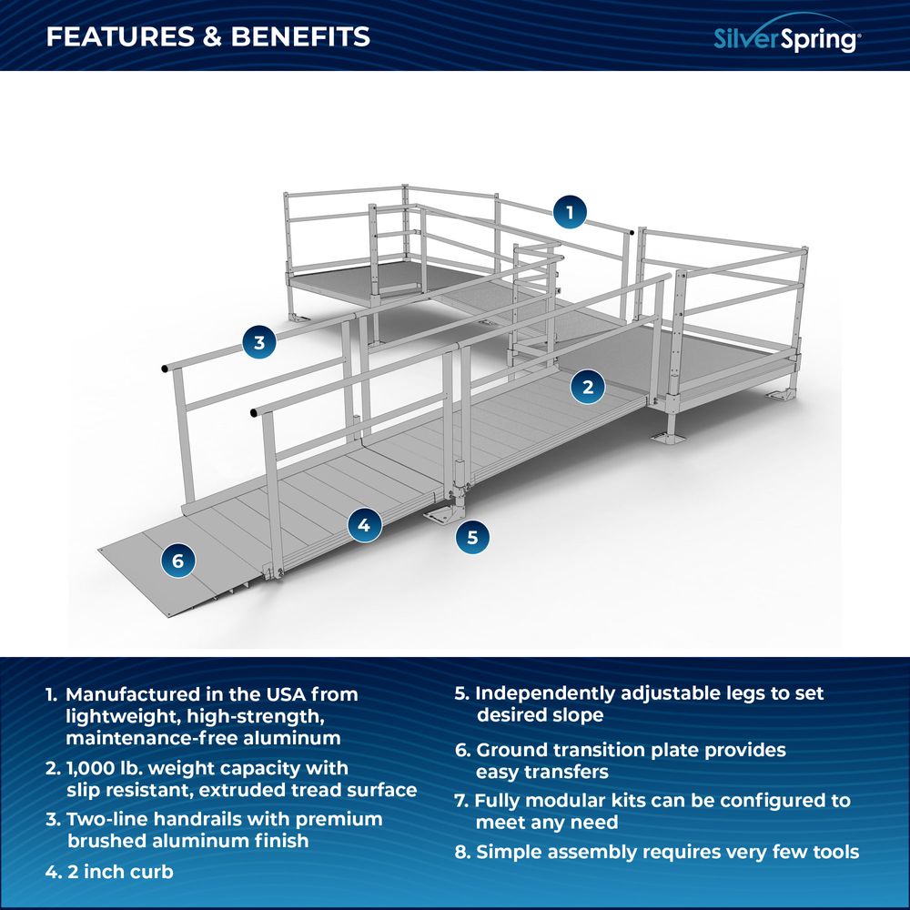 Designed with your needs in mind, the Silver Spring Clearway Modular Ramp System ships rapidly and assembles with fewer tools than other modular systems. Manufactured in the United States from high-strength, lightweight aluminum that will never rust or require painting, this system includes everything you need for installation straight out of the box. Use it to overcome rises with a slope range from 1:6 to 1:14, perfect for home entryways and similar residential applications.