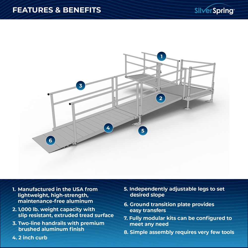 Designed with your needs in mind, the Silver Spring Clearway Modular Ramp System ships rapidly and assembles with fewer tools than other modular systems. Manufactured in the United States from high-strength, lightweight aluminum that will never rust or require painting, this system includes everything you need for installation straight out of the box. Use it to overcome rises with a slope range from 1:6 to 1:14, perfect for home entryways and similar residential applications.