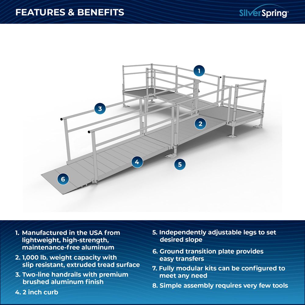 Designed with your needs in mind, the Silver Spring Clearway Modular Ramp System ships rapidly and assembles with fewer tools than other modular systems. Manufactured in the United States from high-strength, lightweight aluminum that will never rust or require painting, this system includes everything you need for installation straight out of the box. Use it to overcome rises with a slope range from 1:6 to 1:14, perfect for home entryways and similar residential applications.