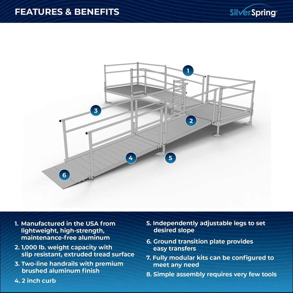 - Includes one 5'x5' top platform, one 6' ramp, one 5'x5' turn platform, two 6' ramps, and accompanying two-line brushed aluminum handrails for added support.