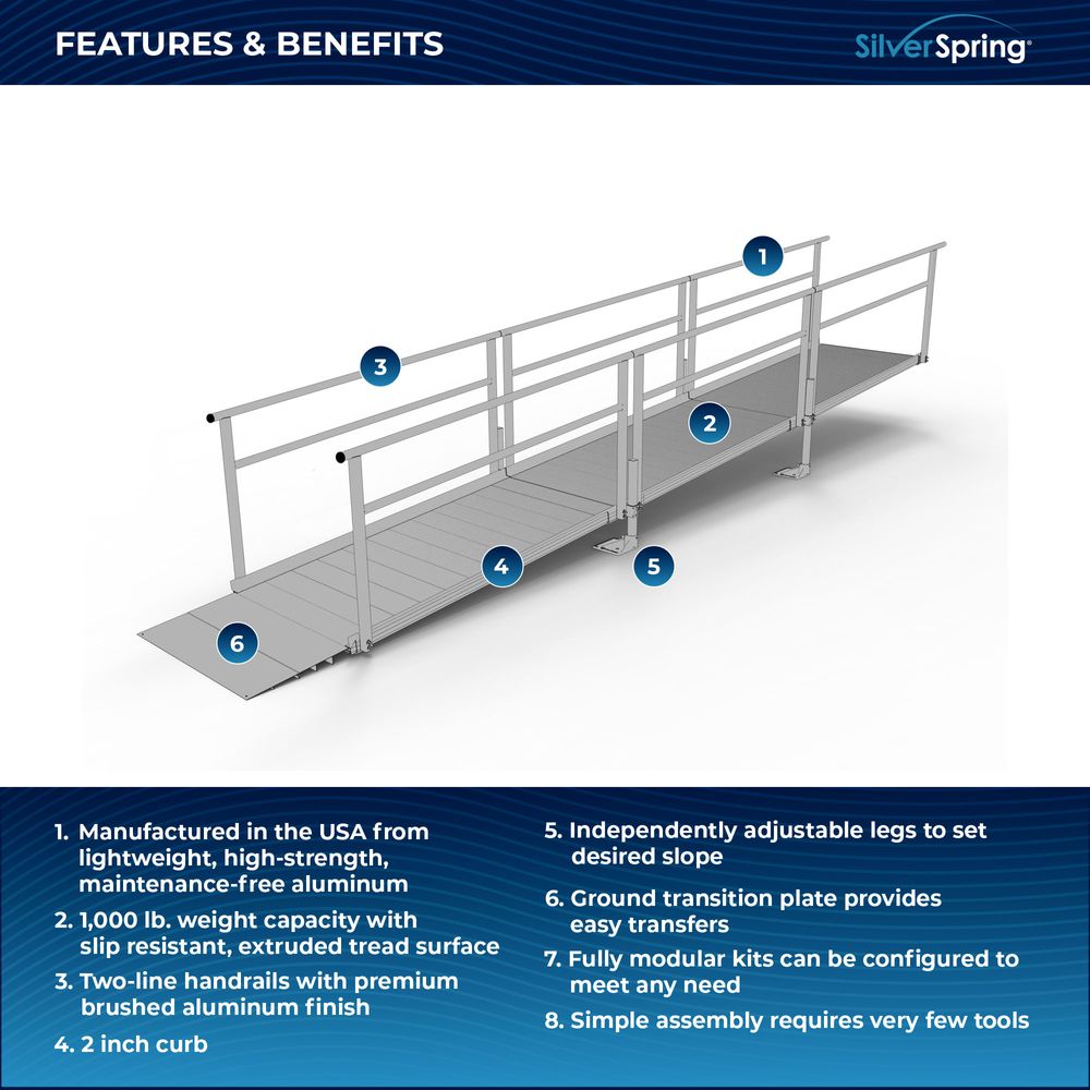 Designed with your needs in mind, the Silver Spring Clearway Modular Ramp System ships rapidly and assembles with fewer tools than other modular systems. Manufactured in the United States from high-strength, lightweight aluminum that will never rust or require painting, this system includes everything you need for installation straight out of the box. Use it to overcome rises with a slope range from 1:6 to 1:14, perfect for home entryways and similar residential applications.