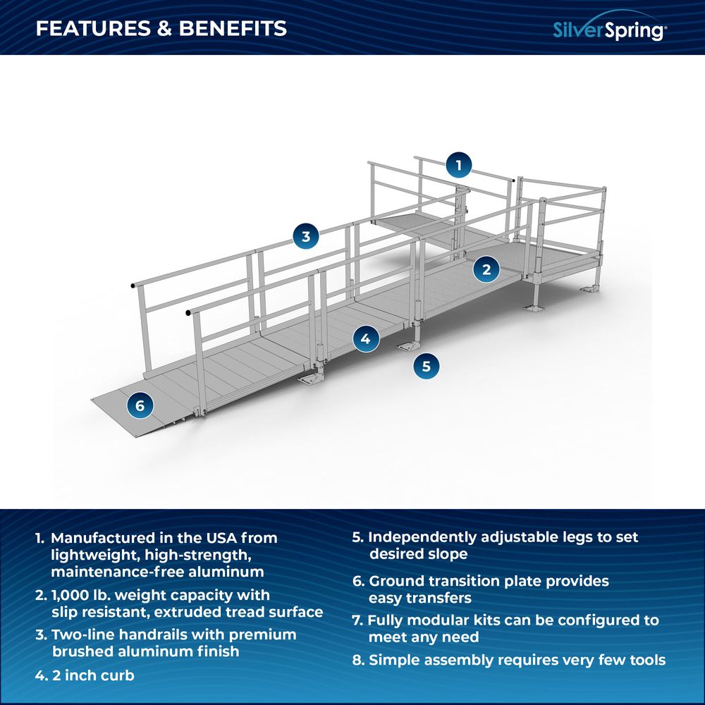 Designed with your needs in mind, the Silver Spring Clearway Modular Ramp System ships rapidly and assembles with fewer tools than other modular systems. Manufactured in the United States from high-strength, lightweight aluminum that will never rust or require painting, this system includes everything you need for installation straight out of the box. Use it to overcome rises with a slope range from 1:6 to 1:14, perfect for home entryways and similar residential applications.