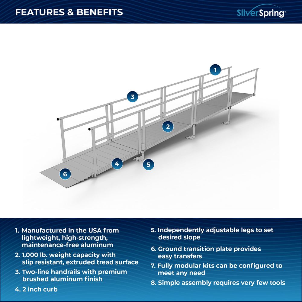 Designed with your needs in mind, the Silver Spring Clearway Modular Ramp System ships rapidly and assembles with fewer tools than other modular systems. Manufactured in the United States from high-strength, lightweight aluminum that will never rust or require painting, this system includes everything you need for installation straight out of the box. Use it to overcome rises with a slope range from 1:6 to 1:14, perfect for home entryways and similar residential applications.