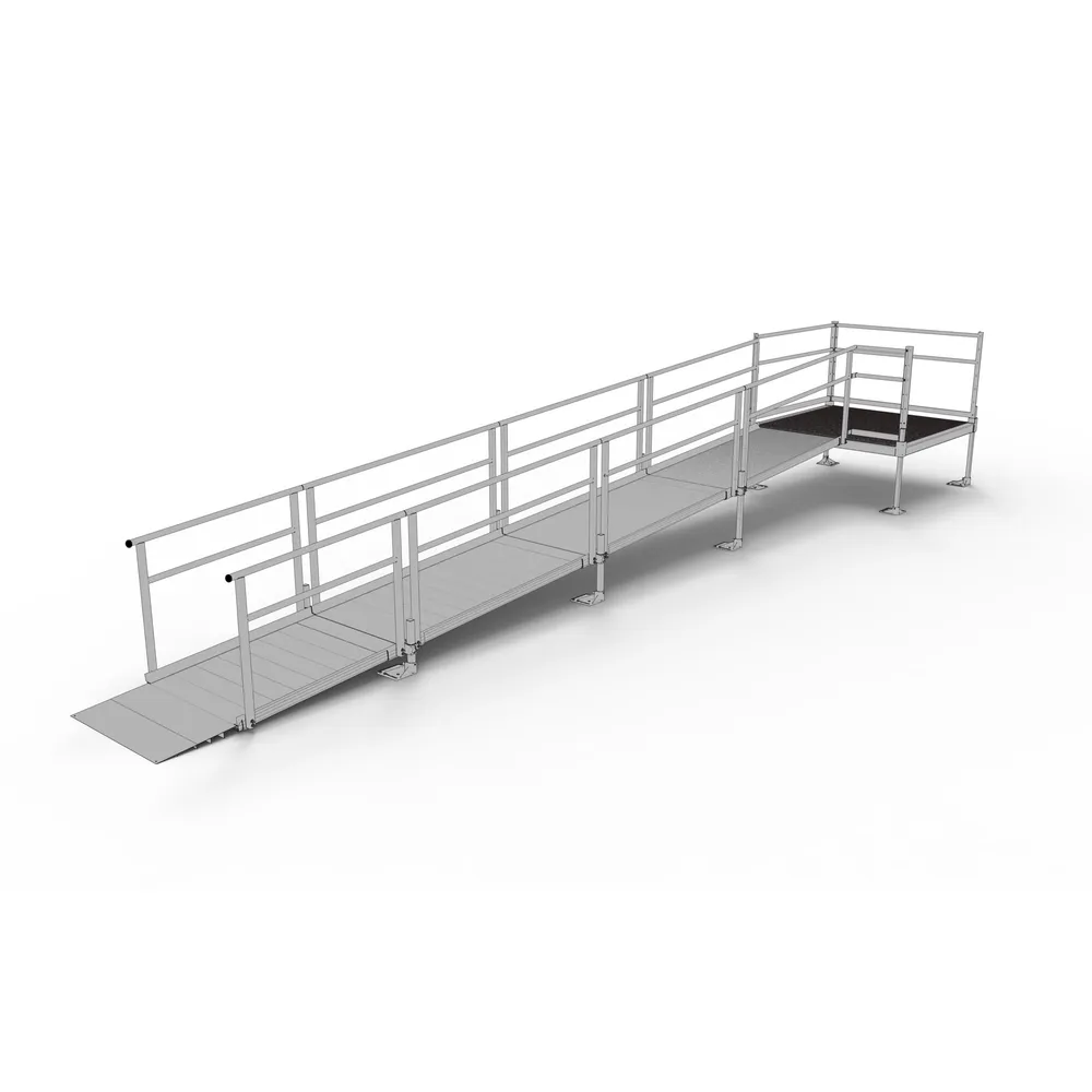 - Includes one 5'x5' platform, three 6' ramps, one 4' ramp, and accompanying two-line brushed aluminum handrails for added support.
