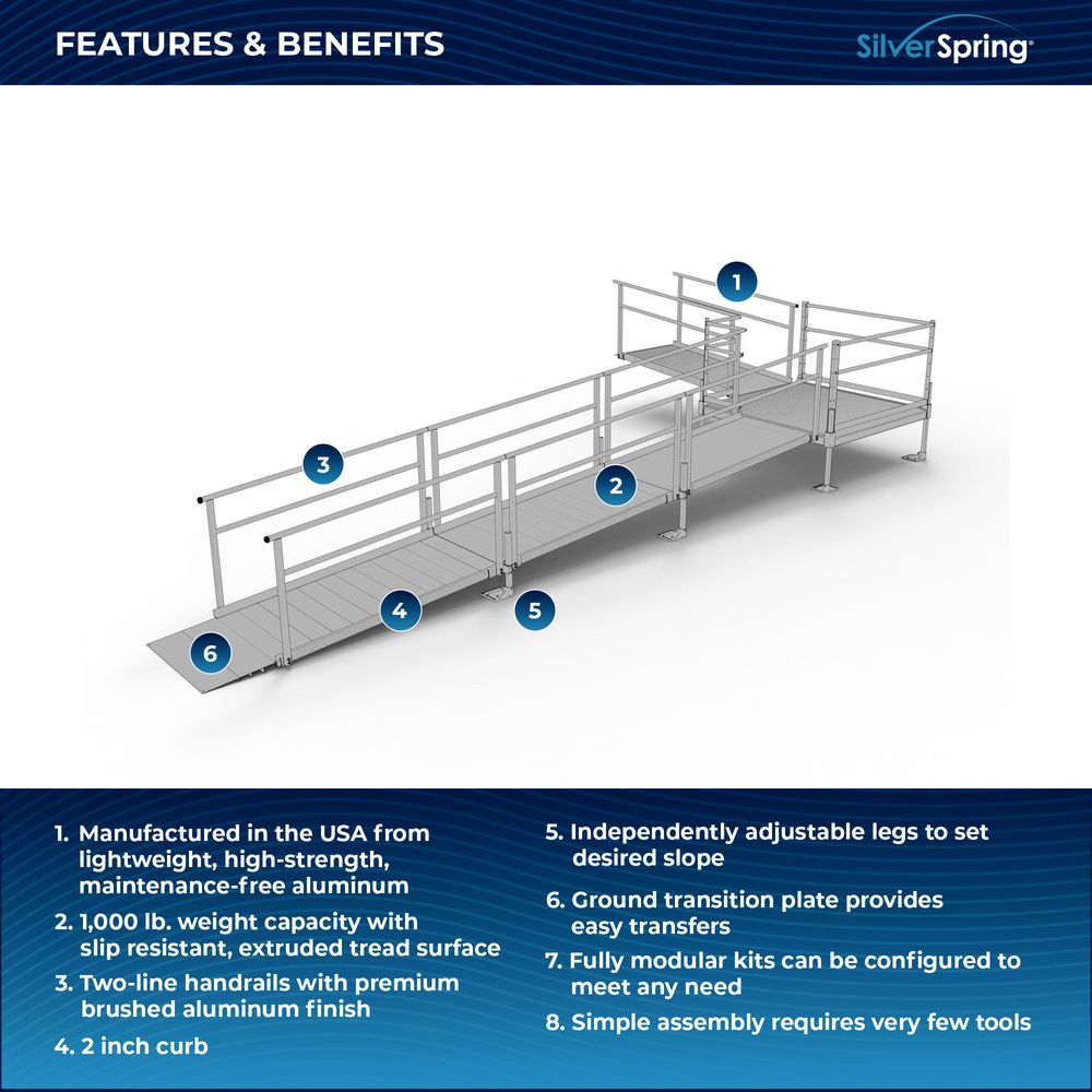 Designed with your needs in mind, the Silver Spring Clearway Modular Ramp System ships rapidly and assembles with fewer tools than other modular systems. Manufactured in the United States from high-strength, lightweight aluminum that will never rust or require painting, this system includes everything you need for installation straight out of the box. Use it to overcome rises with a slope range from 1:6 to 1:14, perfect for home entryways and similar residential applications.