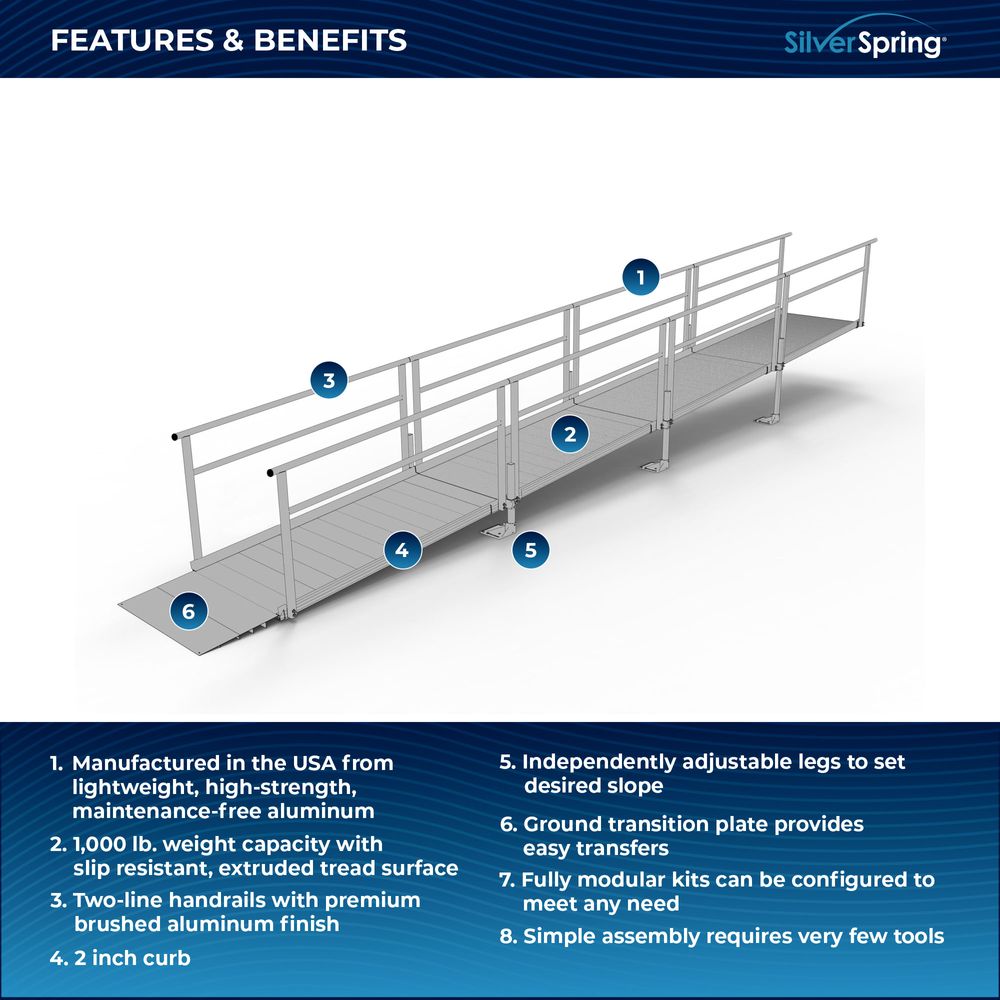 Designed with your needs in mind, the Silver Spring Clearway Modular Ramp System ships rapidly and assembles with fewer tools than other modular systems. Manufactured in the United States from high-strength, lightweight aluminum that will never rust or require painting, this system includes everything you need for installation straight out of the box. Use it to overcome rises with a slope range from 1:6 to 1:14, perfect for home entryways and similar residential applications.