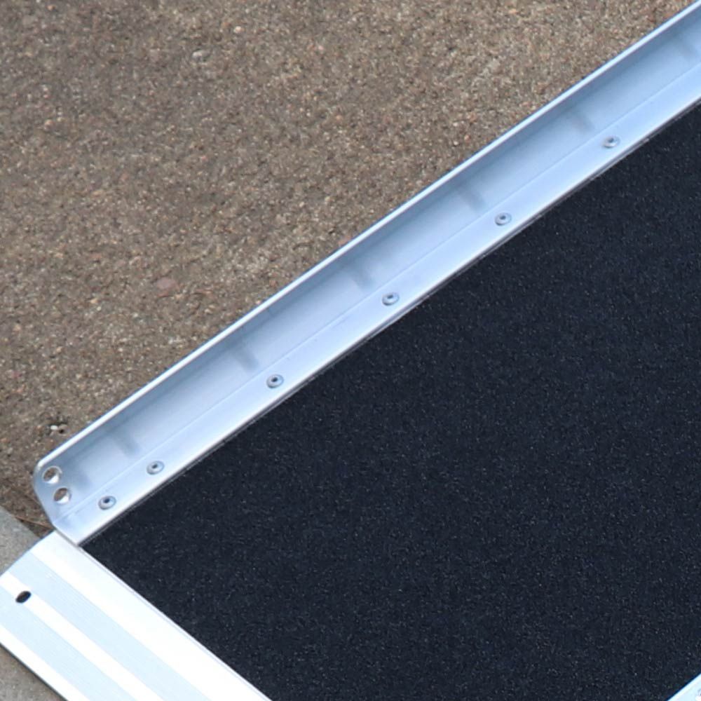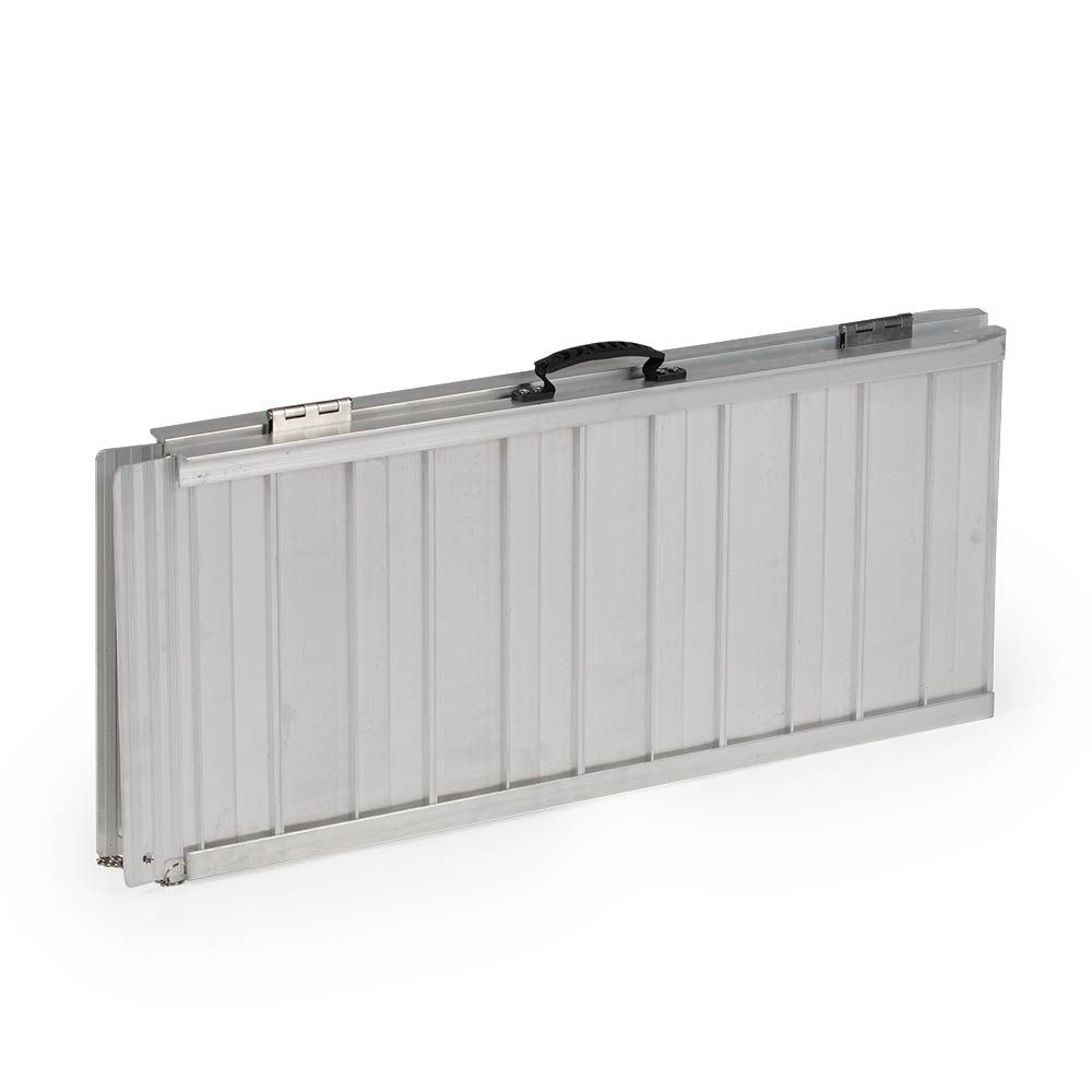 The Titan Ramps 3' x 30" Single Folding Ramp is a lifesaver for wheelchair or mobility scooter users who need quick assistance with single steps. This ramp is multipurpose and is wide enough for most wheelchairs, scooters, walkers, and bikes. With its 500 lb. weight capacity, it can support most chairs and scooters. Its high-traction, waterproof surfaces ensure safe and easy transport in all conditions. This ramp's safest and most secure placement is over a single step to protect against overly steep inclines. Place it against the incline to roll up a short rise to the next level. The ramp is designed with slip-resistant traction tape so you can get through doors safely, regardless of the weather. You can even leave it outside all year round. When the ramp is no longer needed, fold it into its briefcase design to make transportation quick and easy. It fits easily inside car trunks to bring it wherever you need it.