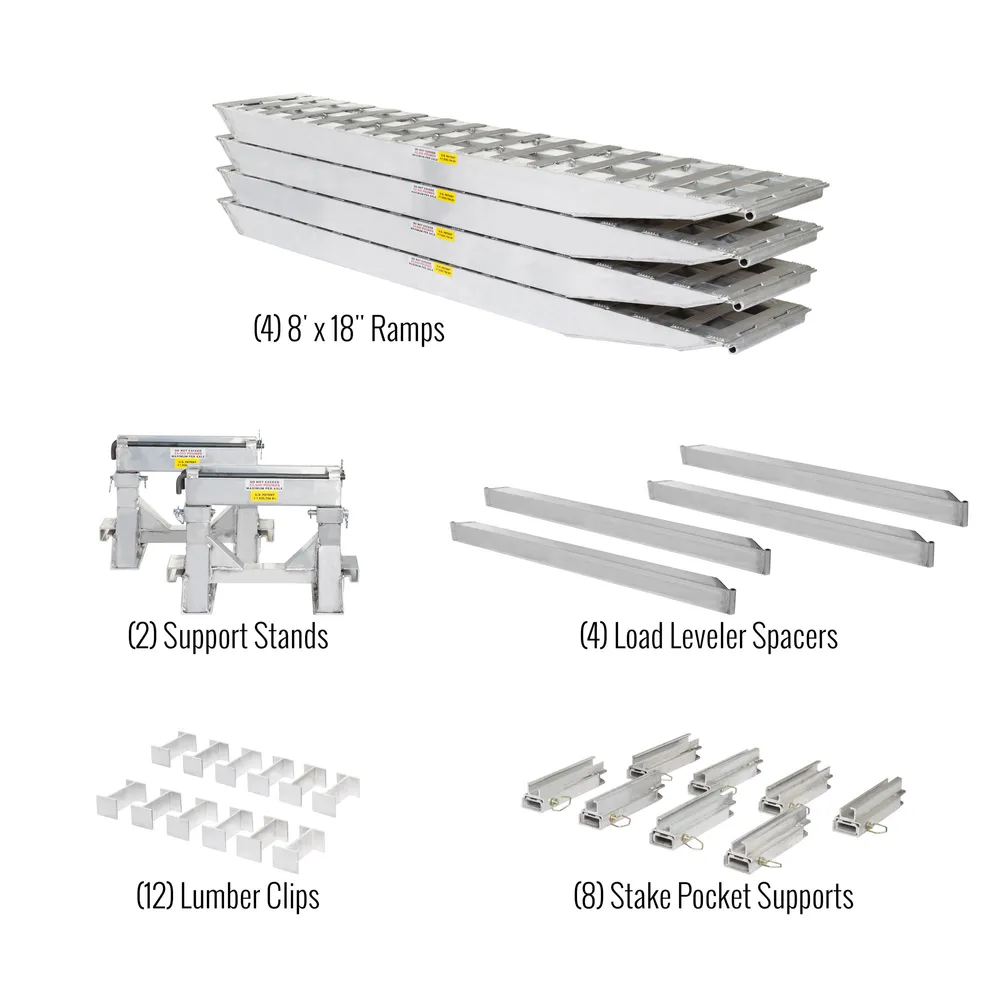- Kit includes four 8' L x 18" W x 5" H aluminum ramps with pin-on ends, eight stake pocket supports for load levelers, twelve lumber securing clips, four load leveler spacers, and two adjustable ramp support stands