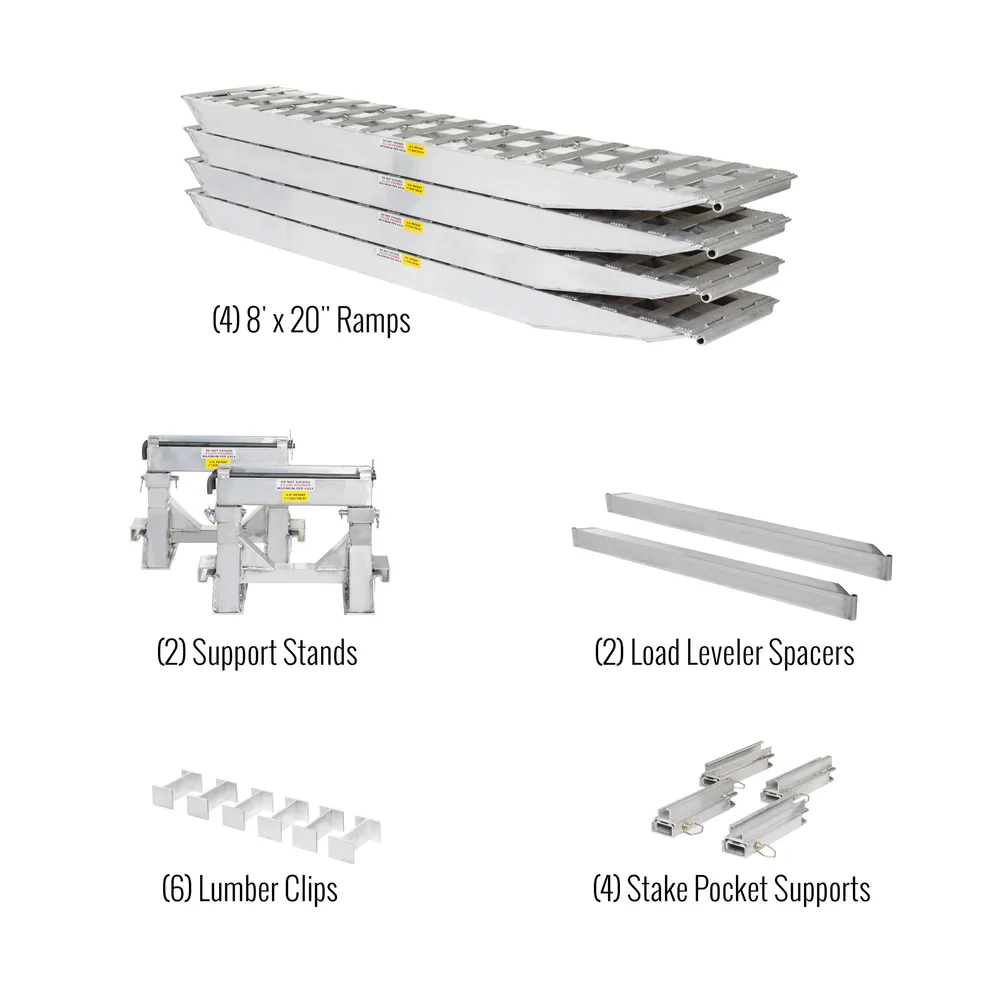 - Kit includes four 8' L x 20" W x 5" H aluminum ramps with pin-on ends, four stake pocket supports for load levelers, six lumber securing clips, two load leveler spacers, and two adjustable ramp support stands