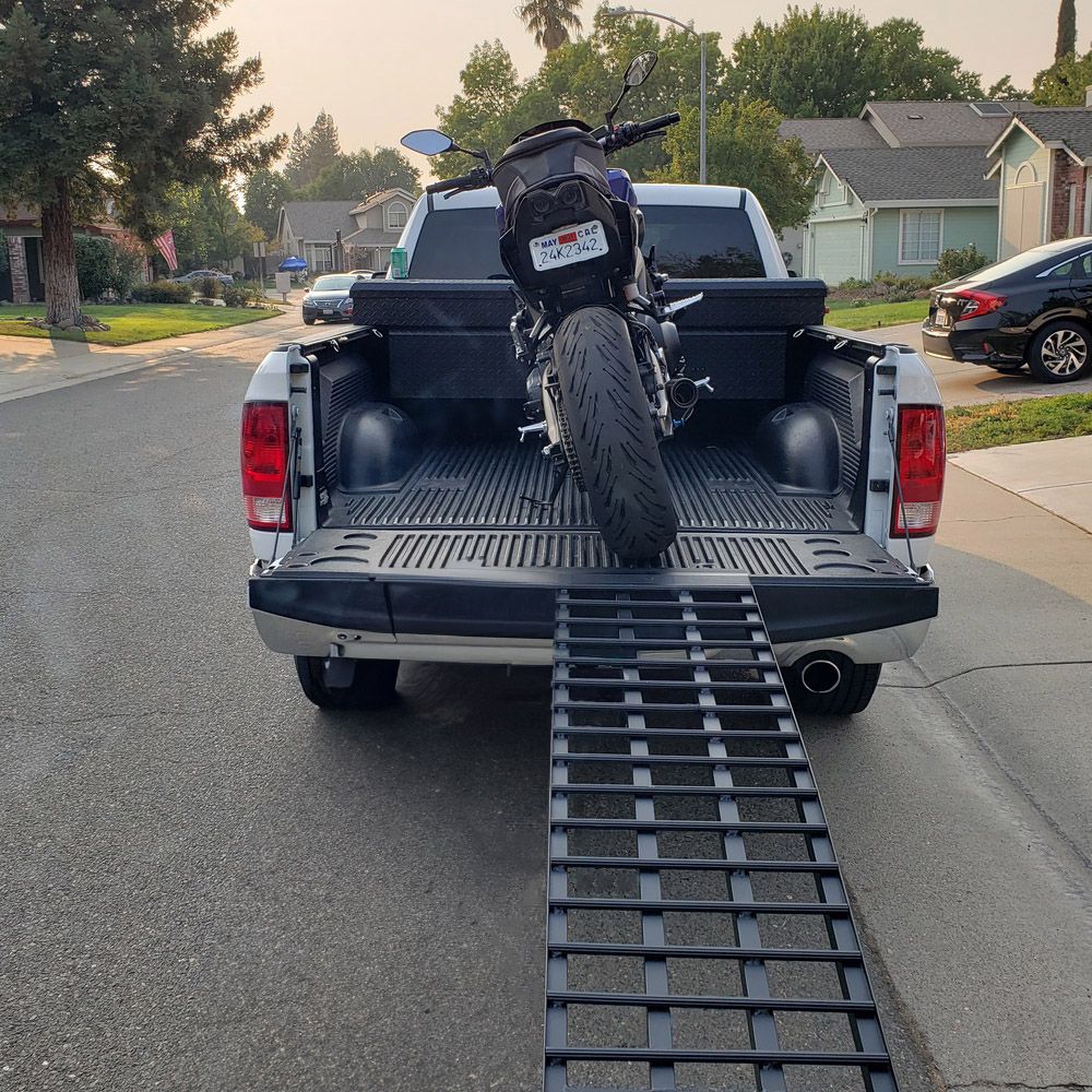 This loading ramp is built from high-strength solid aluminum and features a 4-beam design with wide 5/8 " rungs, raised sides to keep your tire on the ramp channels, and a solid plate-style lip to support the ramp on your vehicle. Quickly hook the ramp to your trailer or pick-up truck with the included safety strap, then load your motorcycle inside.