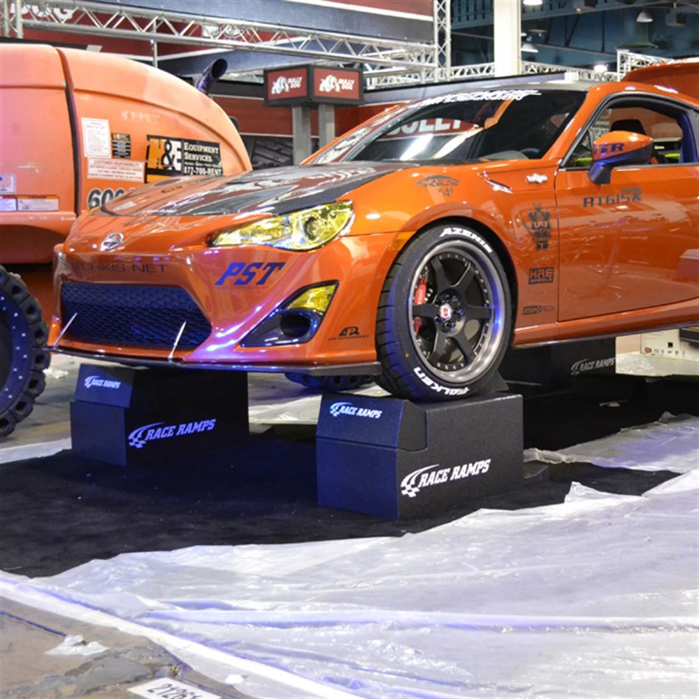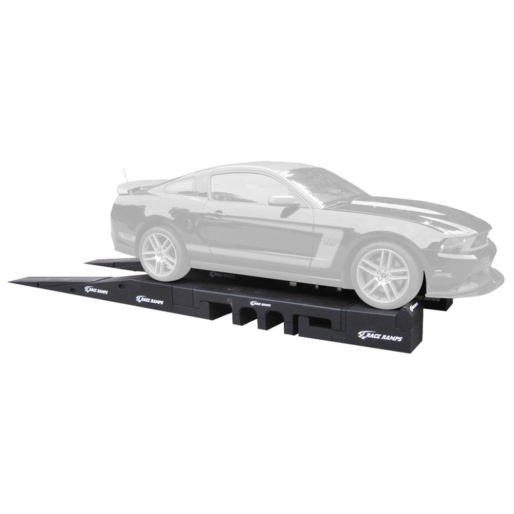 Use the Race Ramps™ Solid Portable Pit Stop Ramps for displays and vehicle maintenance. Manufactured from a lightweight, slip-resistant high-density foam which will not scratch or dent floor or vehicle, each ramp weighs a total of 175 lbs. and can be broken down into parts weighing no more than 40 lbs each. The 10 degree angle is ideal for low-profile vehicles, and the car platform is able to accommodate a wheel base from 98" to 110" wide. When not in use, this pit crew ramp can be stacked in a 65" high space for storage.