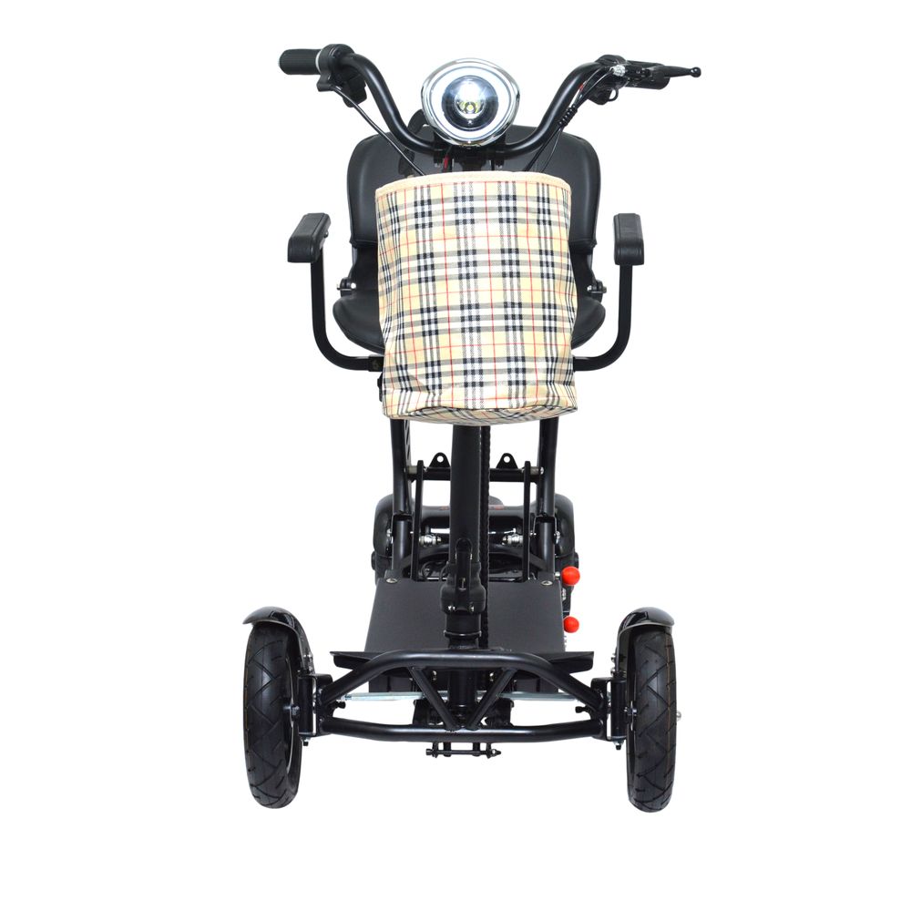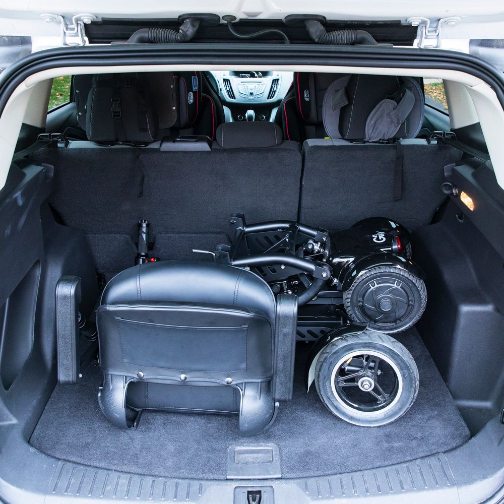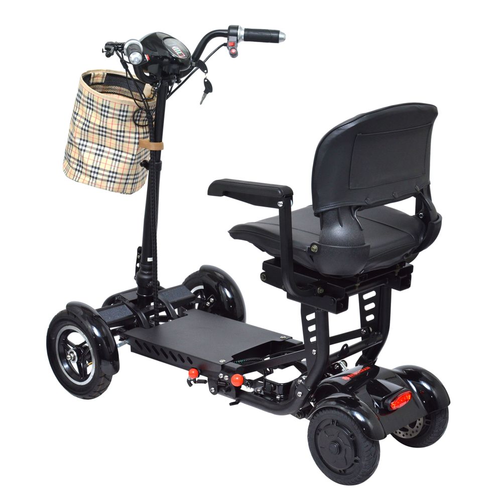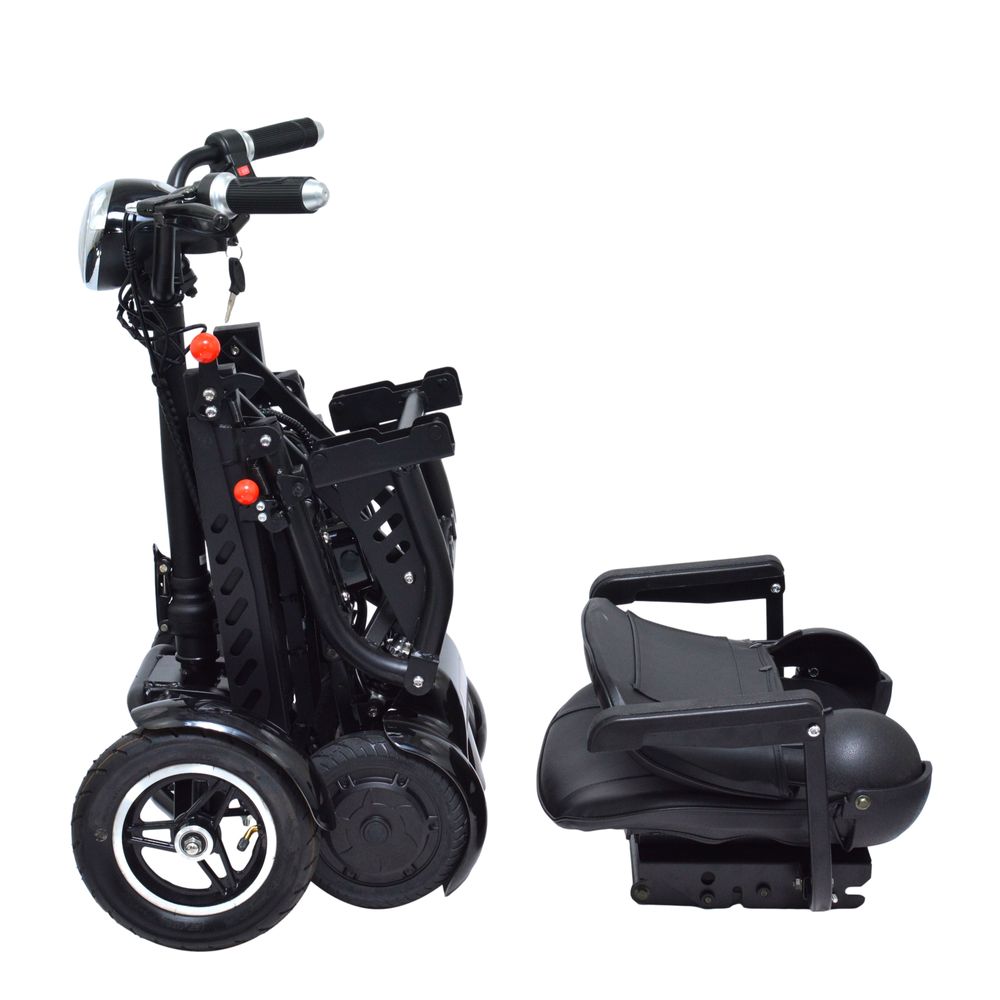 - Folding mobility scooter with a large seat; up to 12MPH