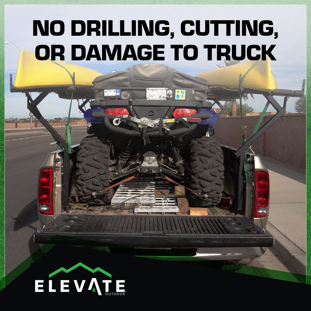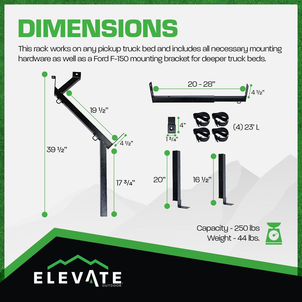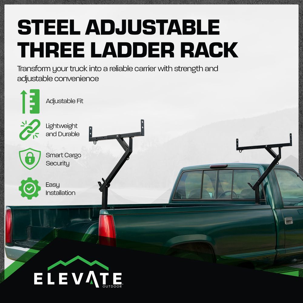 Tackle your largest jobs with ease with the Elevate Outdoor steel universal three ladder rack. A clever truss style support system enables you to carry up to three ladders at one time while dual-width crossbars accommodate loads between 20" and 28" wide. The included hook and loop tie straps and 12 built-in eyelet points ensure that your most difficult-to-carry cargo remains safe at all times. This rack works on any pickup truck bed and includes all necessary mounting hardware as well as a Ford F-150 mounting bracket for deeper truck beds.