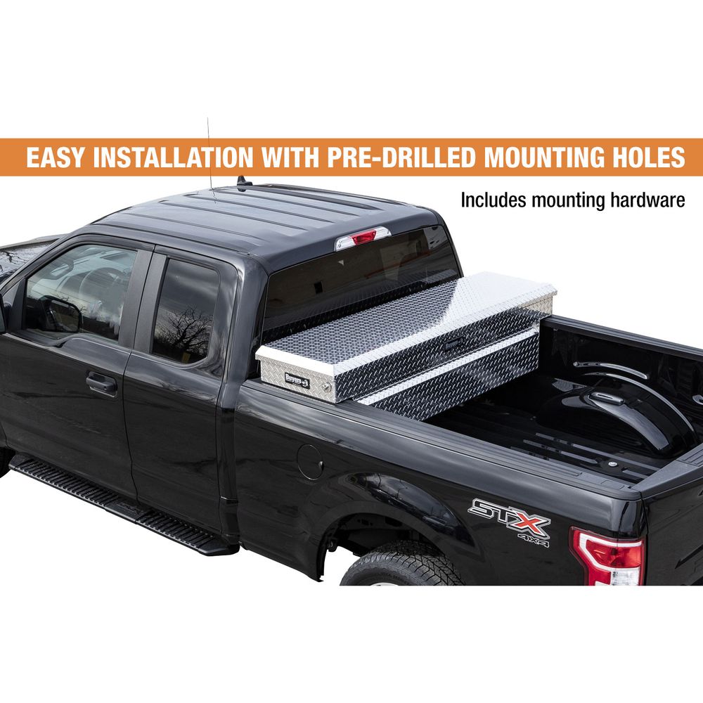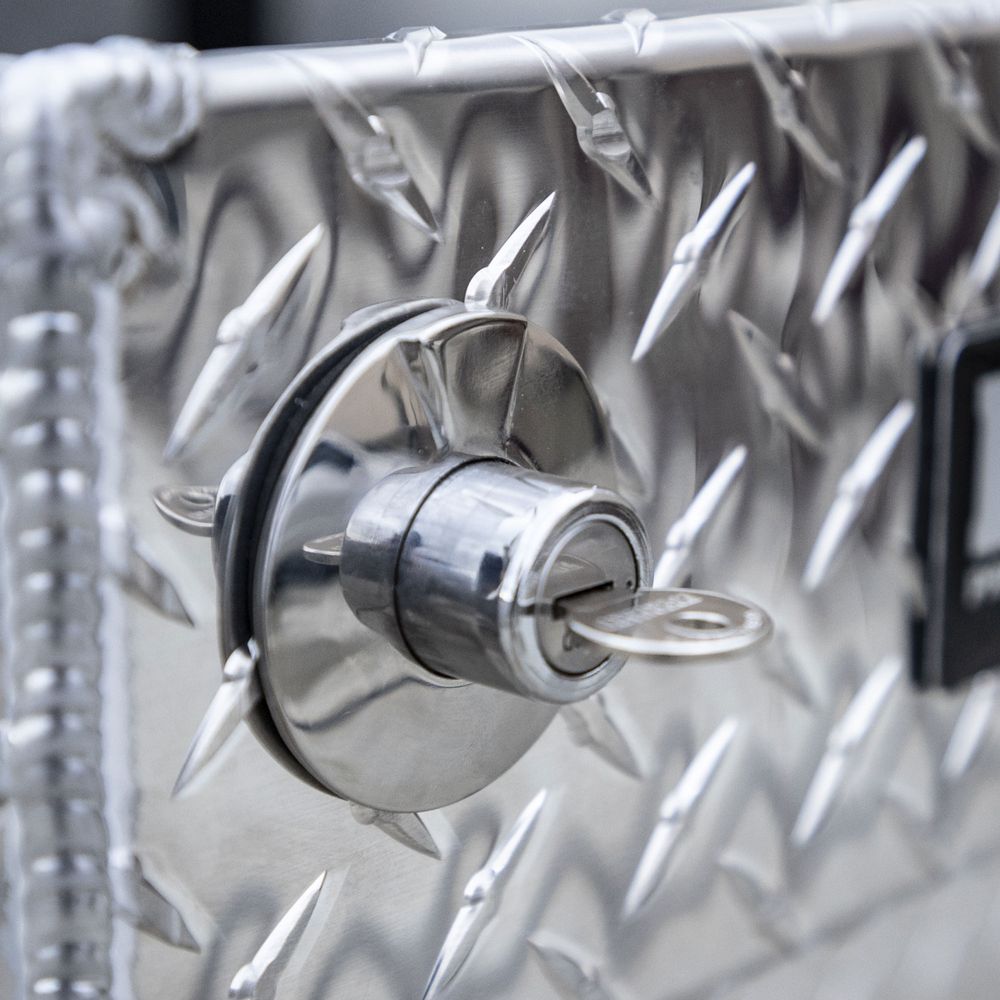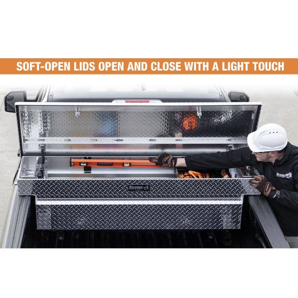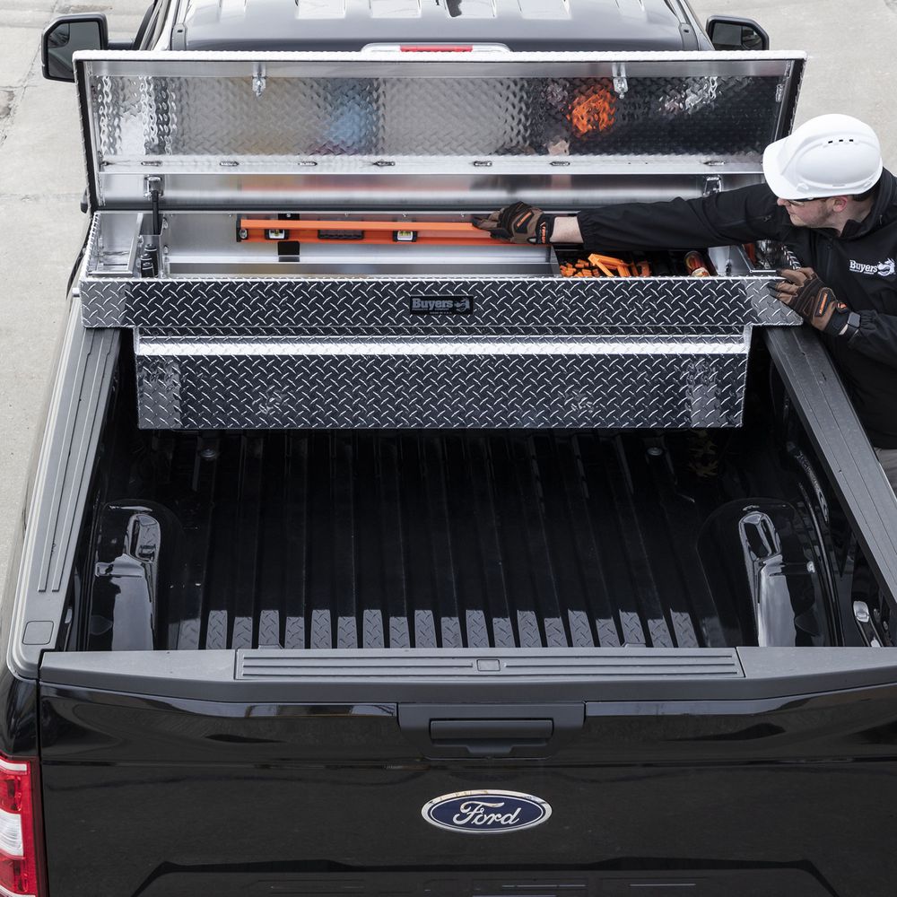 Keep tools and equipment secure with the Buyers Products Diamond Tread Aluminum Crossover Truck Tool Boxes. This durable, lightweight box provides lockable storage for work trucks and suspends from the side rails. This 63" W x 20" D x 13" H tool box fits full-size pickups with beds from 6.5' to 8' long.