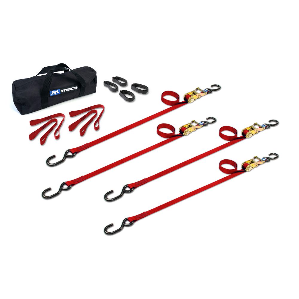 The ATV/Motorcycle Utility Pack includes four 1" ratchet tie-down straps with S-hook ends, four 18" soft loops, four strap bands and one small duffle bag. The S-Hooks on each of the tie downs are encased in a full coat of thick, ruggedized vinyl. Mac's 1" tie-down straps are well known for their strength and dependability, and there's a good reason why. It starts with our premium nylon strapping, rated to 2,800 lbs. Minimum Break Strength (MBS), which significantly improves chafing and UV resistance over box store straps.