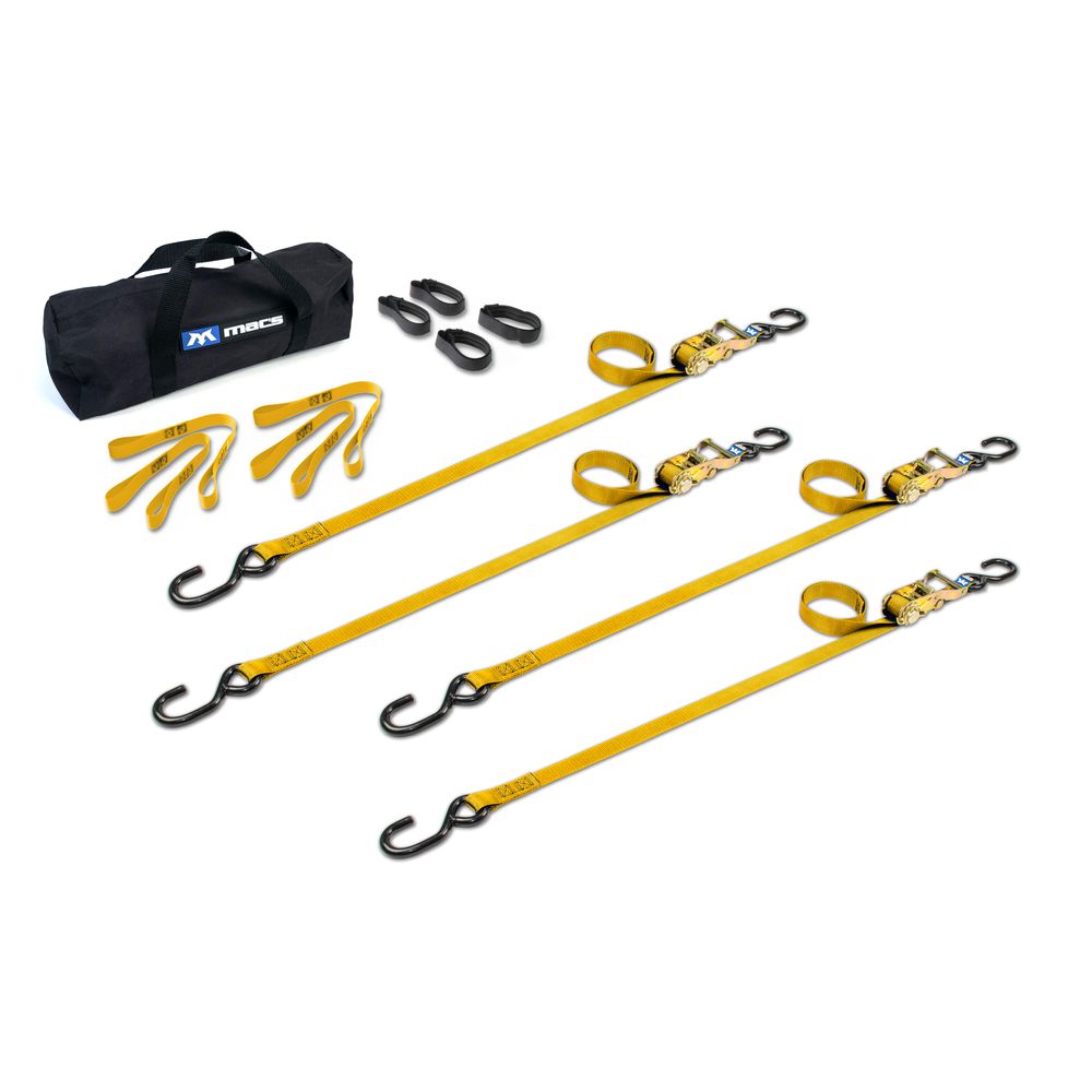The ATV/Motorcycle Utility Pack includes four 1" ratchet tie-down straps with S-hook ends, four 18" soft loops, four strap bands and one small duffle bag. The S-Hooks on each of the tie downs are encased in a full coat of thick, ruggedized vinyl. Mac's 1" tie-down straps are well known for their strength and dependability, and there's a good reason why. It starts with our premium nylon strapping, rated to 2,800 lbs. Minimum Break Strength (MBS), which significantly improves chafing and UV resistance over box store straps.