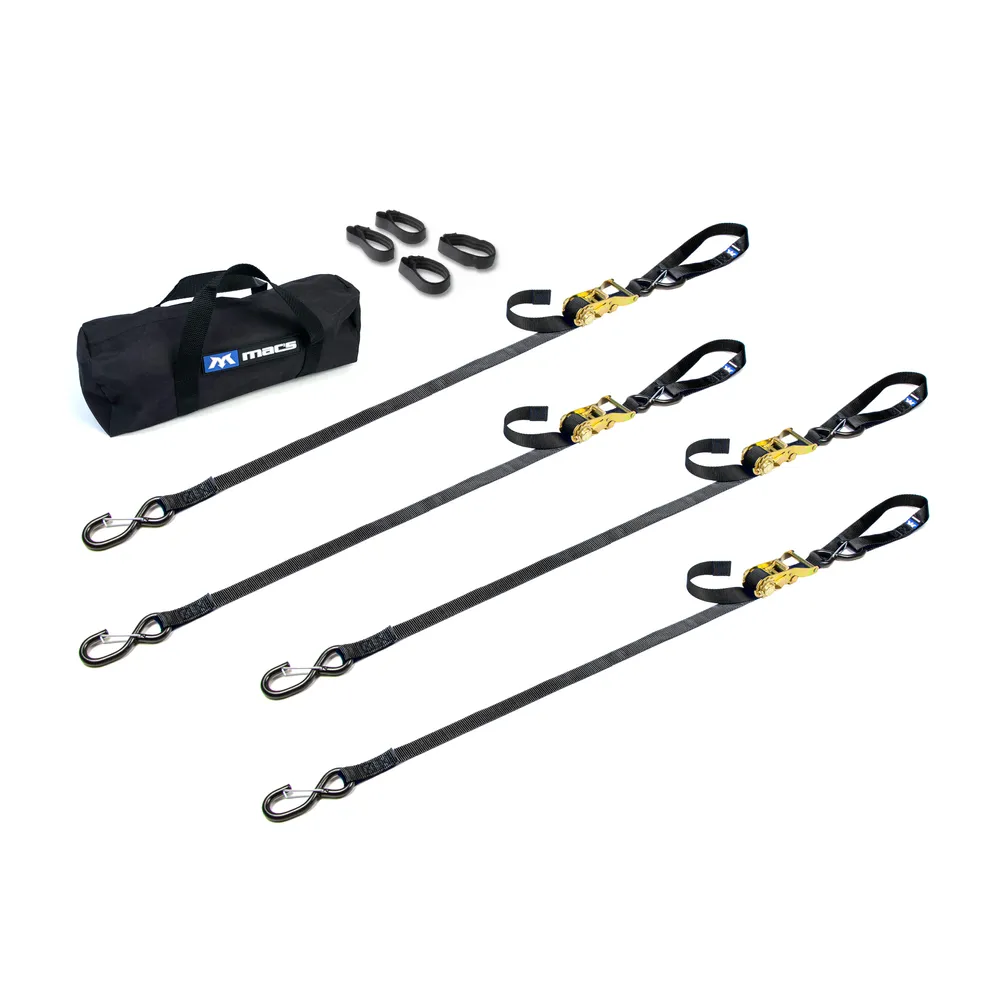This pack includes four ratchet strap tie-downs with S-hook and keeper ends, four 18" integrated soft loops, four strap bands and one small storage bag. Mac's 1" tie-down straps (lashing straps) are well known for their strength and dependability. There's good reason why. It starts with our premium strapping. Rated to 4,000 lbs., the select nylon webbing material we use significantly improves chafing and UV resistance over "box store" straps. During construction of each strap, we sew all ends using the highest stitch count in the industry. You can see this in our characteristic "double box" stitch pattern that ensures maximum tear resistance. The result is a strap with an incredible 2,800 lb. Minimum Breaking Strength (MBS)--more than enough strength for the biggest bike or cargo (recommended working load is 1/3 MBS).