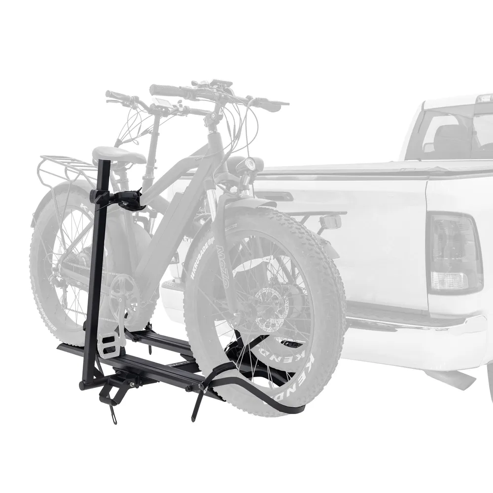 - Safely holds up to two E-bikes, fat tire bikes, and standard adult bikes