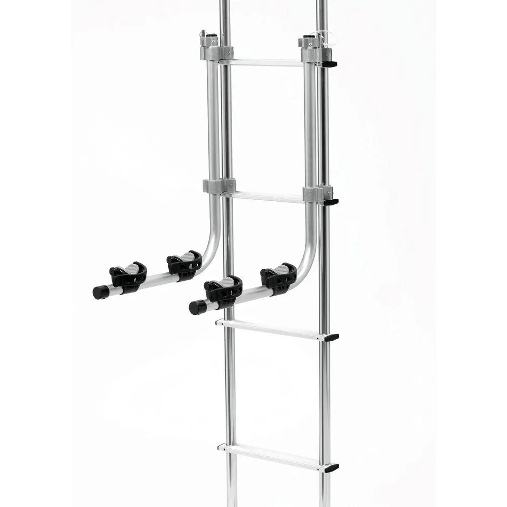 The Surco Ladder-Mounted 2-Bike Rack is a sleek, USA-made solution for RV and van owners. Constructed from heavy gauge aluminum with a bright polish, this rack mounts easily to your vehicle's ladder, accommodating two bikes up to 85 lbs. Its design allows for vertical bike mounting, ensuring your travels are both stylish and secure.