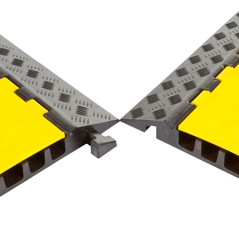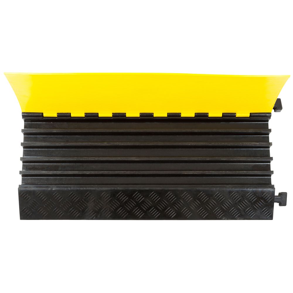 These five-channel heavy-duty Guardian rubber cable protectors keep up to five cables, hoses, or wires protected from vehicle traffic. These cable protectors have four channels that can accommodate cords with outside diameters up to 1.5" and a larger center channel to accommodate hoses and cables up to 1.625" in diameter. The protector features a commercial-grade rubber base with a hinged PVC lid, allowing it to support up to 18,000 lbs per axle. Center sections and optional turn sections (four turn sections are required to make a 90 deg. turn) are joined together with male and female connectors on either side, making it ideal for curving around warehouse racking, large poles, or other objects. The surface has a diamond pattern tread for enhanced traction. The yellow flip-up lid is easily visible and has molded in safety warnings.