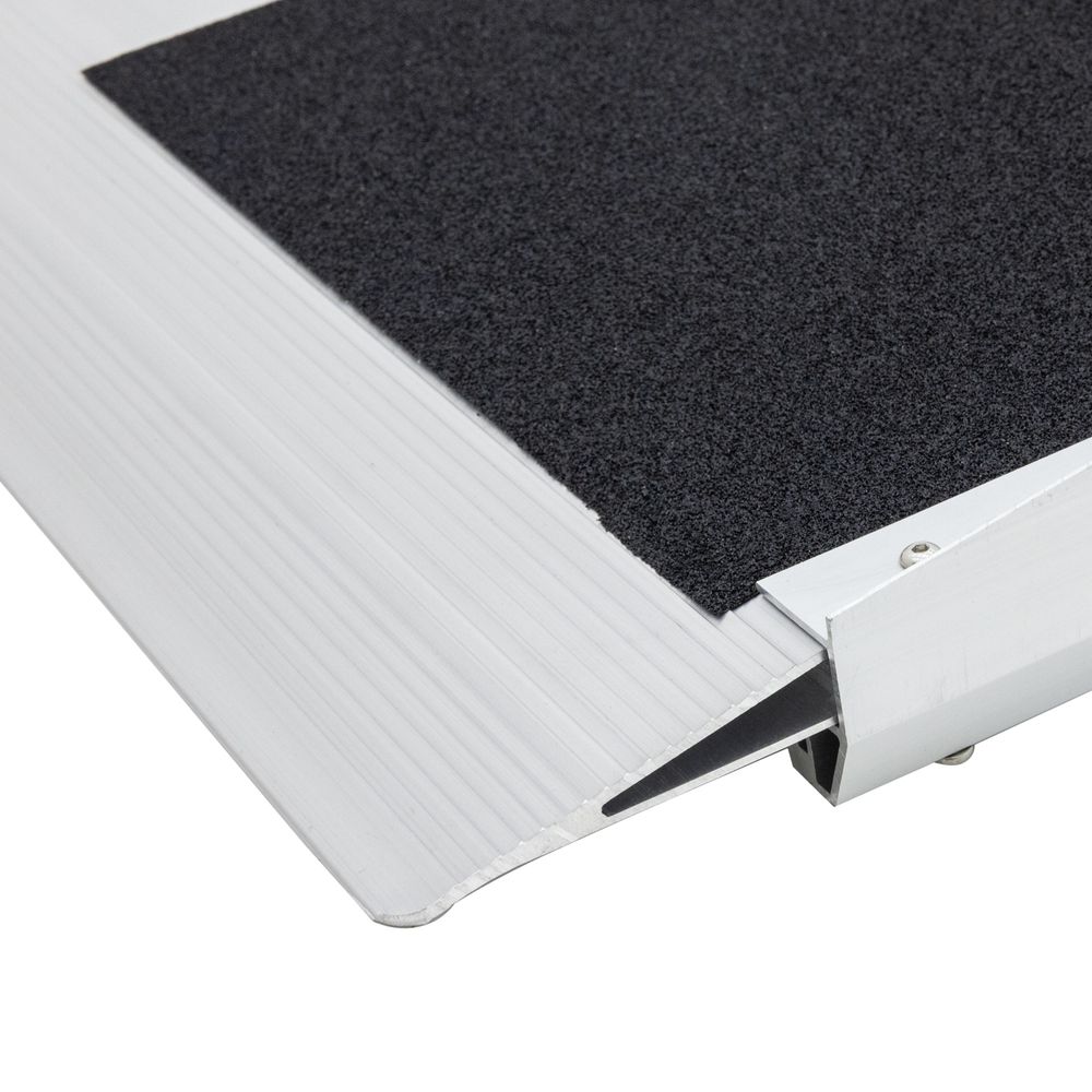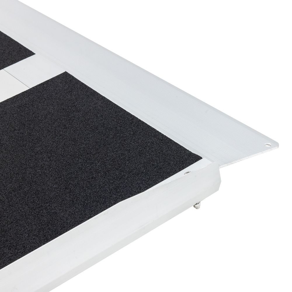 When you need a one-piece ramp to make a step or short rise accessible for wheelchairs, scooters, and individuals who use canes or walkers to get around, this lightweight aluminum ramp is the perfect choice. The ramp offers top-of-the-line safety features including an epoxy grip tape surface for superior traction in wet conditions, and raised side rails for added stability and safety that guide you up the heavy-duty wheelchair ramp.