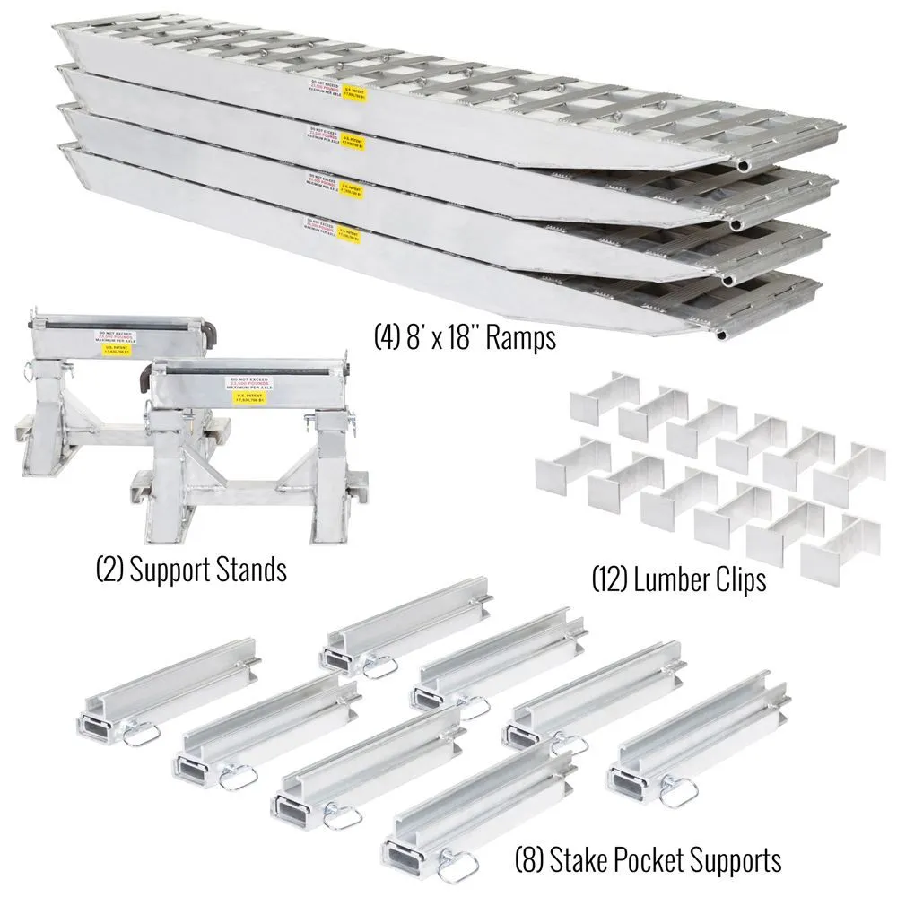 - Kit includes four 8' L x 18" W x 5" H aluminum ramps with pin-on ends, eight stake pocket supports for load levelers, 12 lumber securing clips, two adjustable ramp support stands