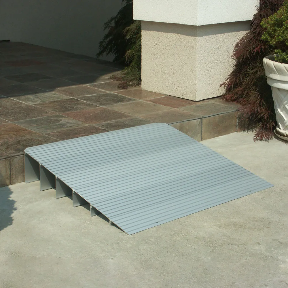 Entry into your home or business will be be safe and easy with EZ-ACCESS ® TRANSITIONS ® Aluminum Modular Threshold Ramps. These threshold ramps provide a smooth transition for those using wheelchairs or scooters and eliminate trip hazards, and are available in multiple sizes to accommodate rises up to 6.25" high. These lightweight aluminum ramps have a modular design to work with a wide range of doorways, raised landings, and sliding doors. They feature a removable channel-mounted flap to provide a smooth transition over a height difference of up to half an inch.