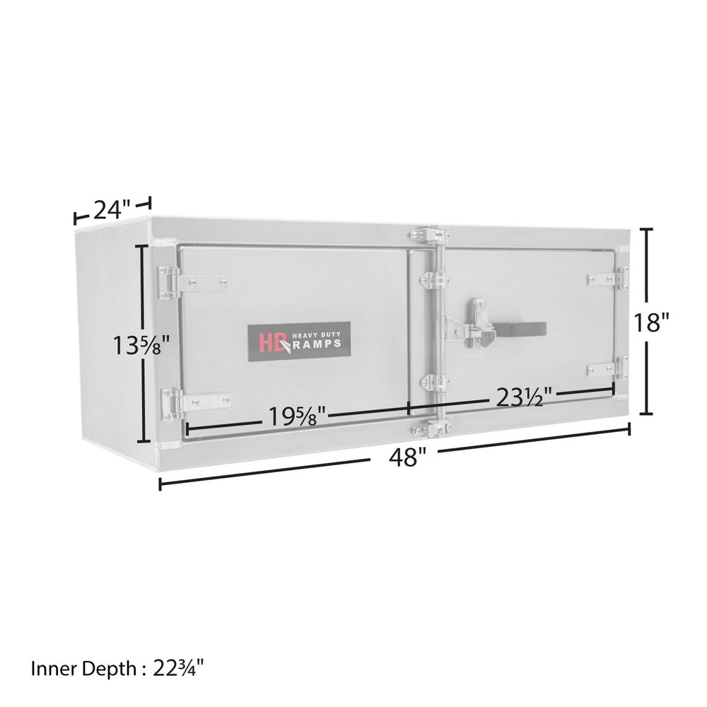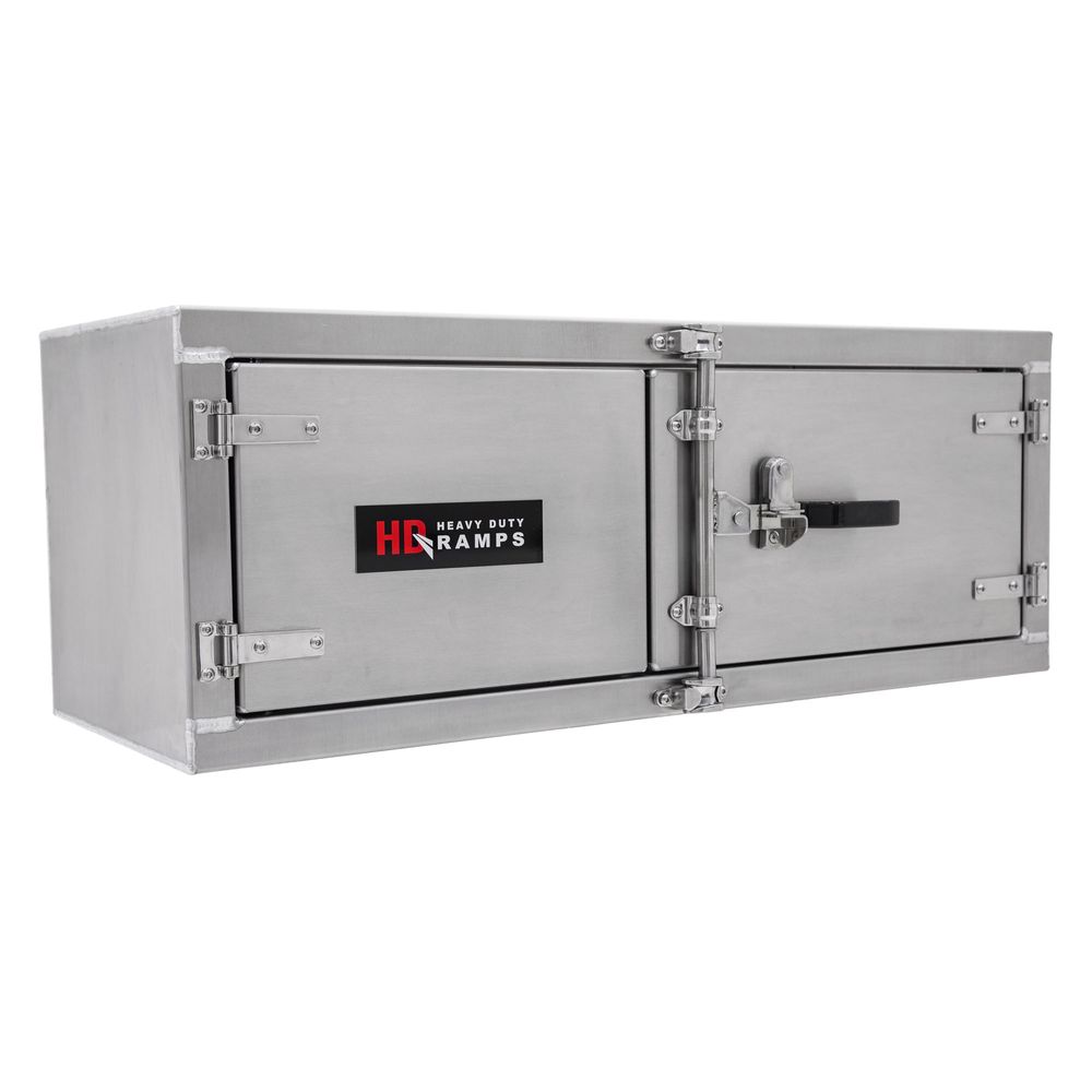 Add external storage to the underbody of flatbed, platform, step-deck or dump truck bodies with the HD Ramps Lockable Underbody Trailer Tool Cabinet. This 48" W x 24" D x 18" H tool box is ideal for holding straps and other equipment when you're on the go, and is manufactured from 1/8" thick aluminum. A rubber weather seal around the inside of the door perimeter locks out moisture or grime. The cam locking mechanism is located on the right side facing, and can fit a padlock (not included) to prevent unauthorized access.