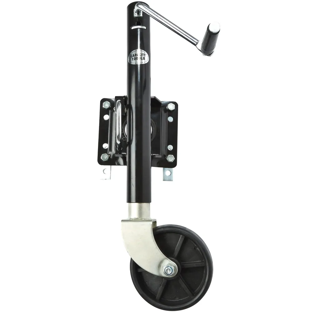 The Trailer Tongue Jack makes it easy to lift and adjust your trailer tongue for quick hitching and unhitching. The heavy-duty tongue jack has a 1,000 lb weight limit and adjusts up to 24" high. The 5-1/2" swivel wheel allows you to move your trailer when it's unhitched. With the quick release handle the trailer tongue jack swings up to a horizontal position during travel. All hardware and mounting brackets are included for easy install.