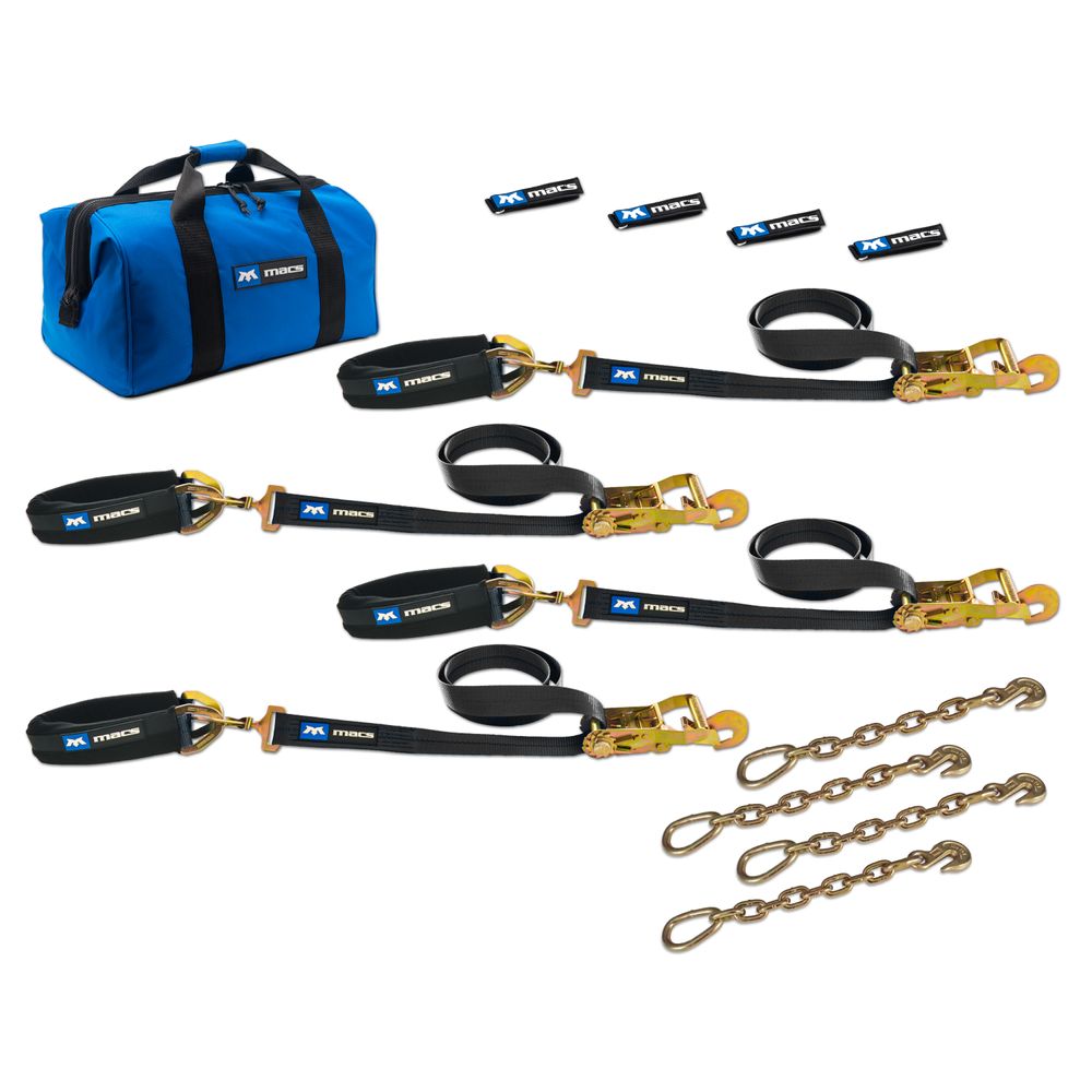 The Pro Pack includes four 2" ratchet straps, four strap wraps, four axle straps, four protective sleeve fleeces, one large canvas storage bag and four chain extensions. Our best-selling 2" ratchet straps and axle straps are each rated at 10,000 lb. load capacity to give you plenty of safety margin. Only the highest quality strap material is used, which significantly improves chafing and UV resistance over "standard" straps. The axle ends are sewn with more than double the stitch count and an 8" long stitch area. This reduces the stresses in this critical region.
